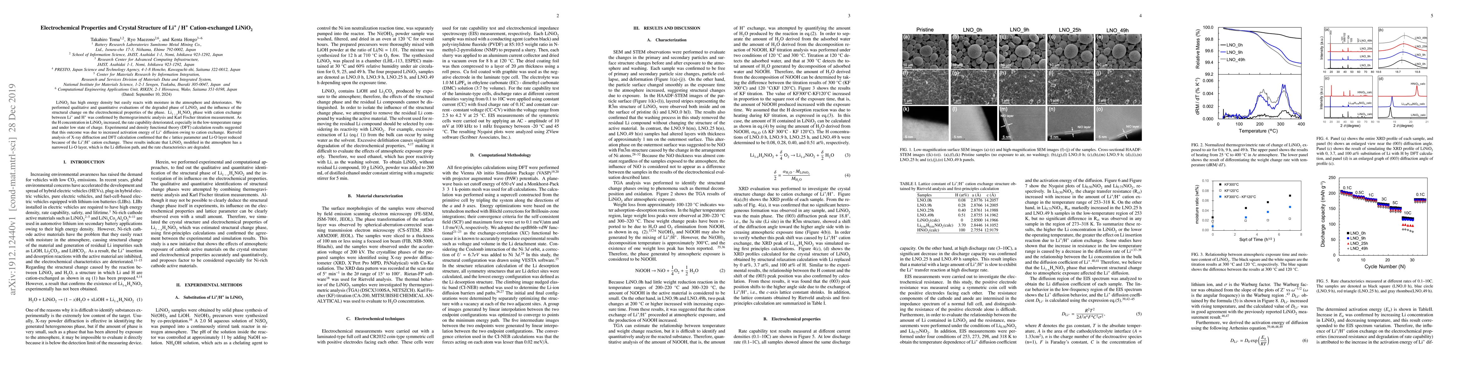 This study investigates the electrochemical properties and crystal structure of LiNiO2 with Li+ / H+ cation exchange, revealing that increased H concentration leads to deteriorated rate capability due to higher Li+ diffusion activation energy. Structural analysis shows a reduction in the c lattice parameter and Li-O layer, indicating a narrowed Li diffusion path.