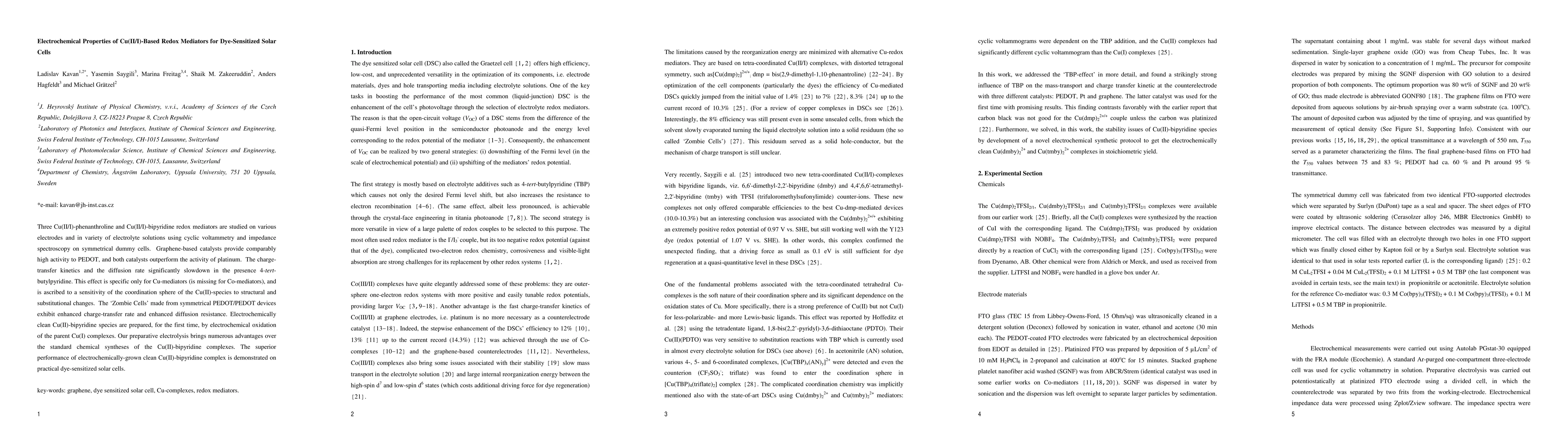 Summary: The electrochemical properties of Cu(II/I)-based redox mediators, including Cu(II/I)-phenanthroline and Cu(II/I)-bipyridine, are investigated using cyclic voltammetry and impedance spectroscopy to evaluate their performance in dye-sensitized solar cells. The study assesses their behavior on different electrodes and in various electrolyte solutions.