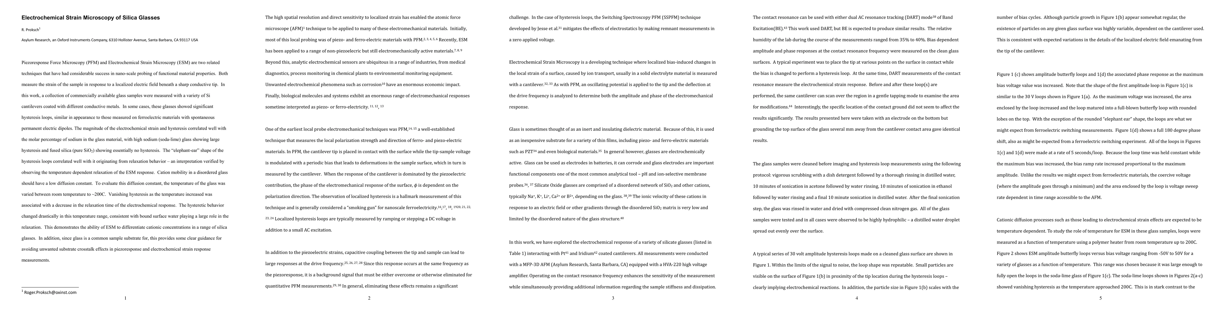 Piezoresponse Force Microscopy (PFM) and Electrochemical Strain Microscopy (ESM) are two related techniques that have had considerable success in nano-scale probing of functional material properties. Both measure the strain of the sample in response to a localized electric field beneath a sharp conductive tip. In this work, a collection of commercially available glass samples were measured with a variety of Si cantilevers coated with different conductive metals. In some cases, these glasses showed significant hysteresis loops, similar in appearance to those measured on ferroelectric materials with spontaneous permanent electric dipoles. The magnitude of the electrochemical strain and hysteresis correlated well with the molar percentage of sodium in the glass material, with high sodium (soda-lime) glass showing large hysteresis and fused silica (pure SiO2) showing essentially no hysteresis. The elephant-ear shape of the hysteresis loops correlated well with it originating from relaxation behavior, an interpretation verified by observing the temperature dependent relaxation of the ESM response. Cation mobility in a disordered glass should have a low diffusion constant. To evaluate this diffusion constant, the temperature of the glass was varied between room temperature and 200C. Vanishing hysteresis as the temperature increased was associated with a decrease in the relaxation time of the electrochemical response. The hysteretic behavior changed drastically in this temperature range, consistent with bound surface water playing a large role in the relaxation. This demonstrates the ability of ESM to differentiate cationic concentrations in a range of silica glasses. In addition, since glass is a common sample substrate for, this provides some clear guidance for avoiding unwanted substrate crosstalk effects in piezoresponse and electrochemical strain response measurements.