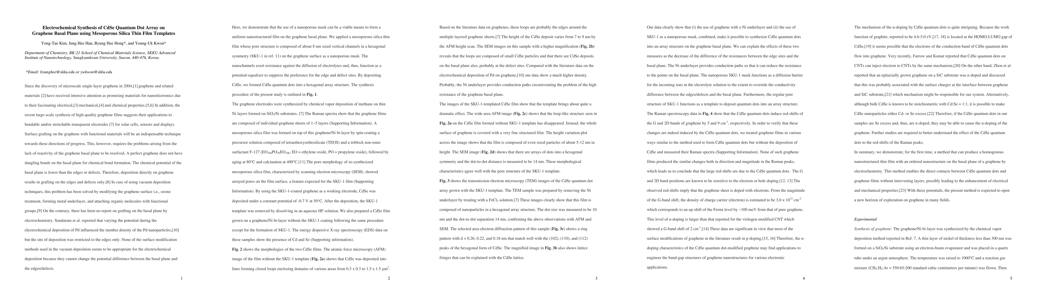 This paper details the electrochemical synthesis of CdSe quantum dots on graphene using mesoporous silica thin film templates to create a uniform hexagonal array on the graphene basal plane, ensuring even growth across edge/defect sites and the basal plane.