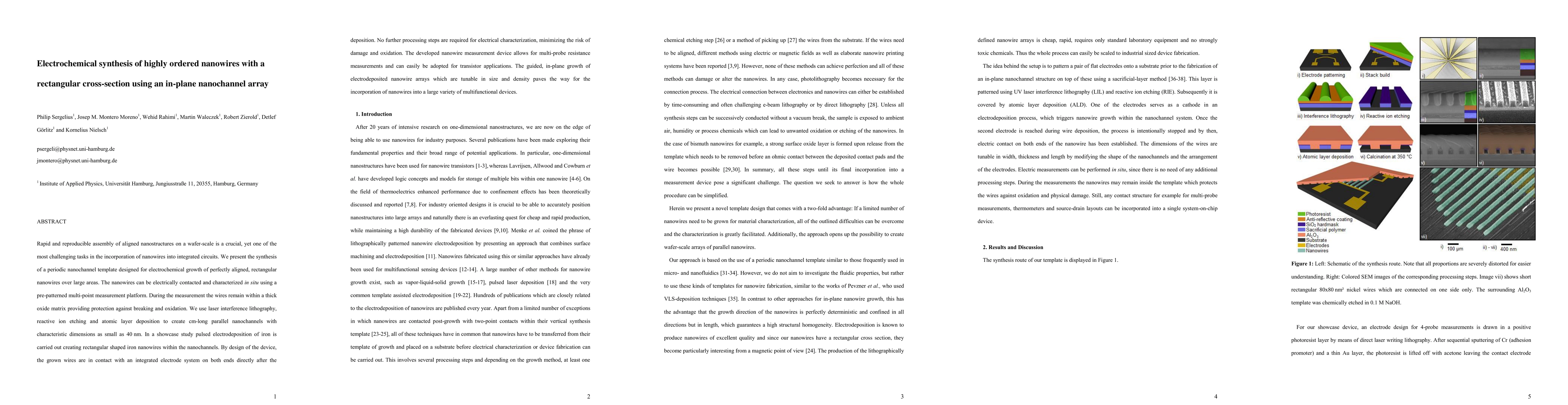 This paper details the electrochemical synthesis of highly ordered rectangular nanowires using a nanochannel template, enabling large-area assembly and in situ electrical characterization without oxidation or breaking. The method uses laser interference lithography and atomic layer deposition to create precise nanochannels, followed by pulsed electrodeposition of iron to form the nanowires.