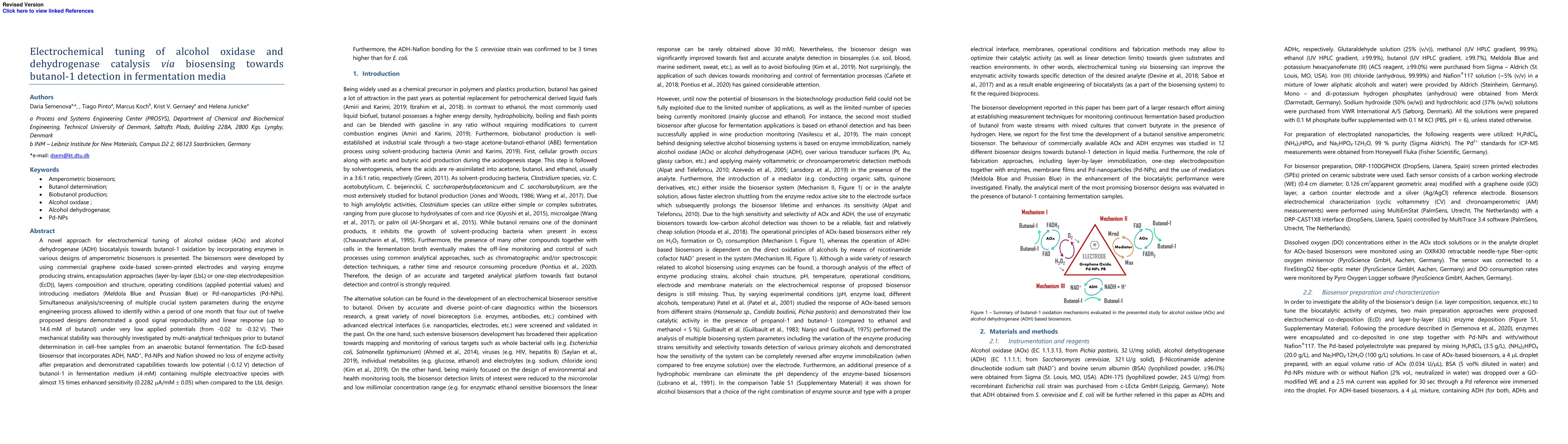 A novel approach for electrochemical tuning of alcohol oxidase (AOx) and alcohol dehydrogenase (ADH) biocatalysis towards butanol-1 oxidation by incorporating enzymes in various designs of amperometric biosensors is presented. The biosensors were developed by using commercial graphene oxide-based screen-printed electrodes and varying enzyme producing strains, encapsulation approaches (layer-by-layer (LbL) or one-step electrodeposition (EcD)), layers composition and structure, operating conditions (applied potential values) and introducing mediators (Meldola Blue and Prussian Blue) or Pd-nanoparticles (Pd-NPs). Simultaneous analysis/screening of multiple crucial system parameters during the enzyme engineering process allowed to identify within a period of one month that four out of twelve proposed designs demonstrated a good signal reproducibility and linear response (up to 14.6 mM of butanol) under very low applied potentials (from -0.02 to -0.32 V). Their mechanical stability was thoroughly investigated by multi-analytical techniques prior to butanol determination in cell-free samples from an anaerobic butanol fermentation. The EcD-based biosensor that incorporates ADH, NAD+, Pd-NPs and Nafion showed no loss of enzyme activity after preparation and demonstrated capabilities towards low potential (-0.12 V) detection of butanol-1 in fermentation medium (4 mM) containing multiple electroactive species with almost 15 times enhanced sensitivity (0.2282 $\mu$A/mM $\pm$ 0.05) when compared to the LbL design. Furthermore, the ADH-Nafion bonding for the S. cerevisiae strain was confirmed to be 3 times higher than for E. coli.