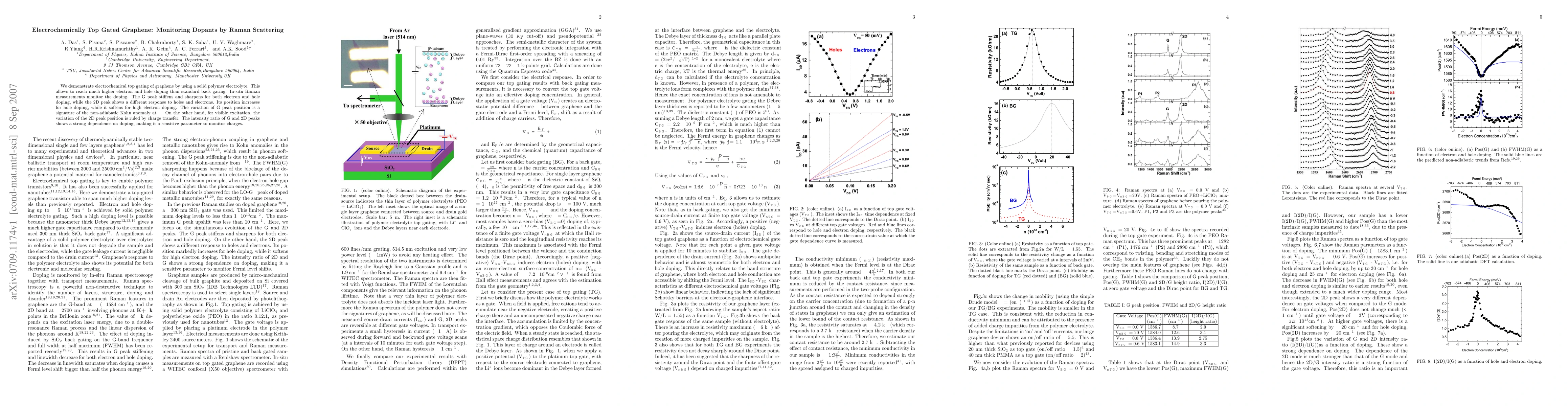 This study demonstrates electrochemical top gating of graphene with a solid polymer electrolyte, enabling higher electron and hole doping levels than standard back gating. In-situ Raman measurements reveal distinct responses in the G and 2D peaks, providing a sensitive means to monitor dopant levels through peak position and intensity ratios.