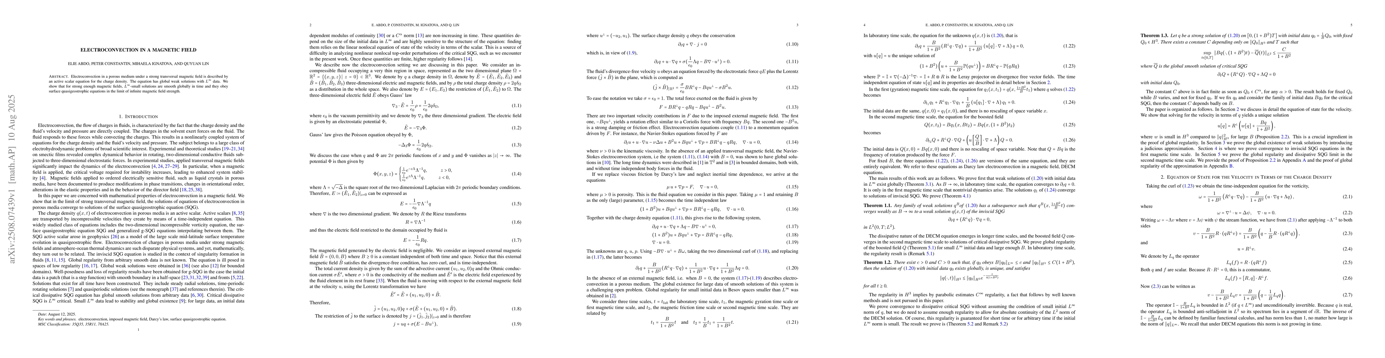 Electroconvection in a porous medium under a strong transversal magnetic field is described by an active scalar equation for the charge density. The equation has global weak solutions with $L^{\infty}$ data. We show that for strong enough magnetic fields, $L^{\infty}$-small solutions are smooth globally in time and they obey surface quasigeostrophic equations in the limit of infinite magnetic field strength.