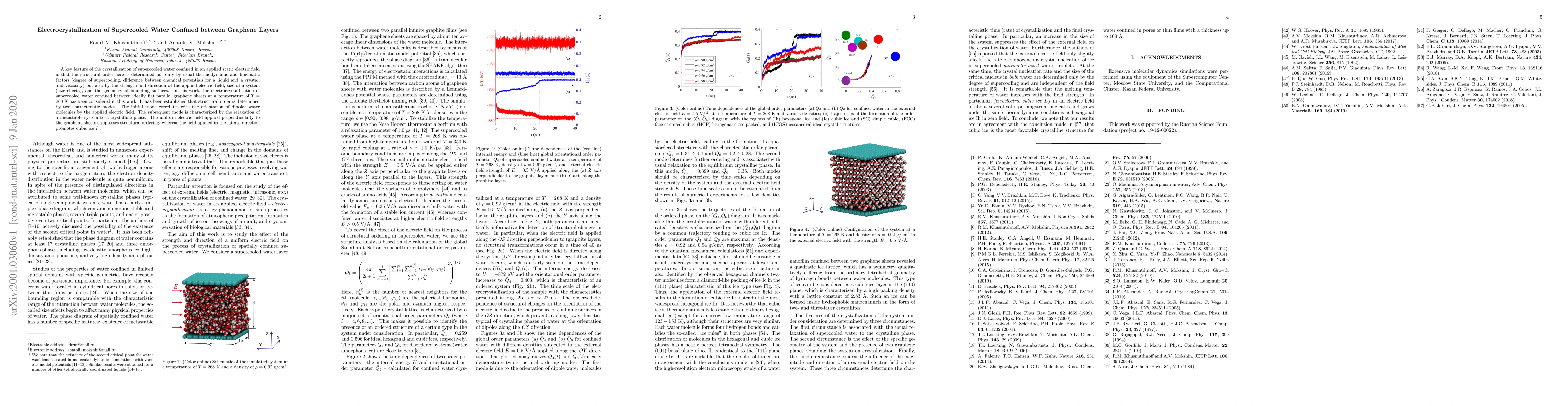 A key feature of the crystallization of supercooled water confined in an applied static electric field is that the structural order here is determined not only by usual thermodynamic and kinematic factors (degree of supercooling, difference between chemical potentials for a liquid and a crystal, and viscosity) but also by the strength and direction of the applied electric field, size of a system (size effects), and the geometry of bounding surfaces. In this work, the electrocrystallization of supercooled water confined between ideally flat parallel graphene sheets at a temperature of $T=268$~K has been considered in this work. It has been established that structural order is determined by two characteristic modes. The initial mode correlates with the orientation of dipolar water molecules by the applied electric field. The subsequent mode is characterized by the relaxation of a metastable system to a crystalline phase. The uniform electric field applied perpendicularly to the graphene sheets suppresses structural ordering, whereas the field applied in the lateral direction promotes cubic ice $I_c$.