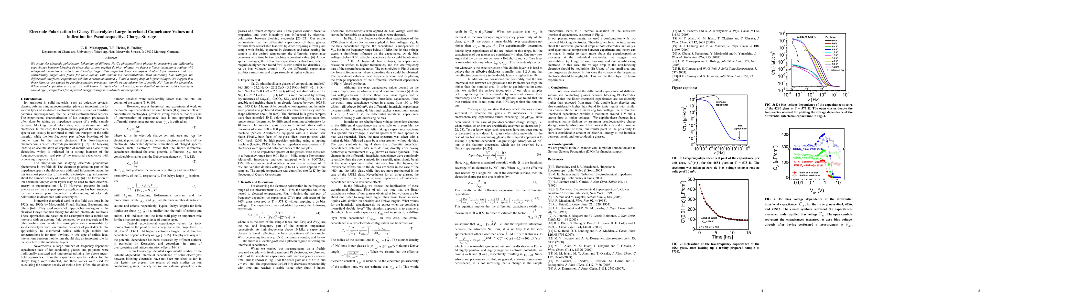 We study the electrode polarization behaviour of different Na-Ca-phosphosilicate glasses by measuring the differential capacitance between blocking Pt electrodes. At low applied dc bias voltages, we detect a linear capacitance regime with interfacial capacitance values considerably larger than expected from double layer theories and also considerably larger than found for ionic liquids with similar ion concentrations. With increasing bias voltages, the differential capacitance of interfacial layer exhibits a maximum around 1 V and a strong drop at higher voltages. We suggest that these features are caused by pseudocapacitive processes, namely by the adsorption of mobile Na+ ions at the electrodes followed by electronic charge transfer. While pseudocapacitive processes are well known in liquid electrochemistry, more detailed studies on solid electrolytes should offer perspectives for improved energy storage in solid-state supercapacitors