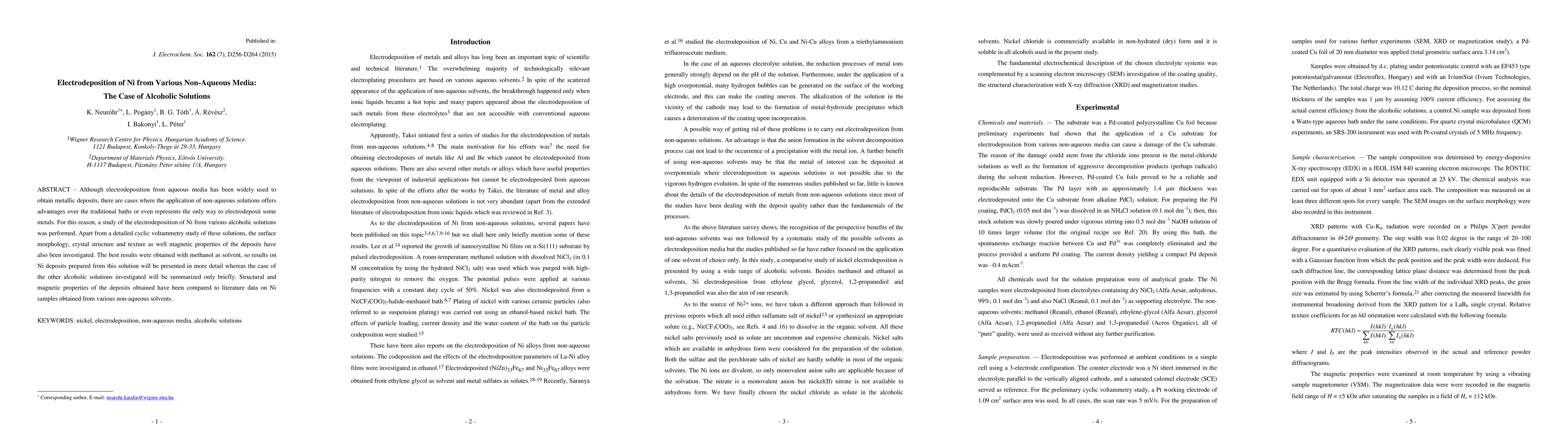 Although electrodeposition from aqueous media has been widely used to obtain metallic deposits, there are cases where the application of non-aqueous solutions offers advantages over the traditional baths or even represents the only way to electrodeposit some metals. For this reason, a study of the electrodeposition of Ni from various alcoholic solutions was performed. Apart from a detailed cyclic voltammetry study of these solutions, the surface morphology, crystal structure and texture as well magnetic properties of the deposits have also been investigated. The best results were obtained with methanol as solvent, so results on Ni deposits prepared from this solution will be presented in more detail whereas the case of the other alcoholic solutions investigated will be summarized only briefly. Structural and magnetic properties of the deposits obtained have been compared to literature data on Ni samples obtained from various non-aqueous solvents.