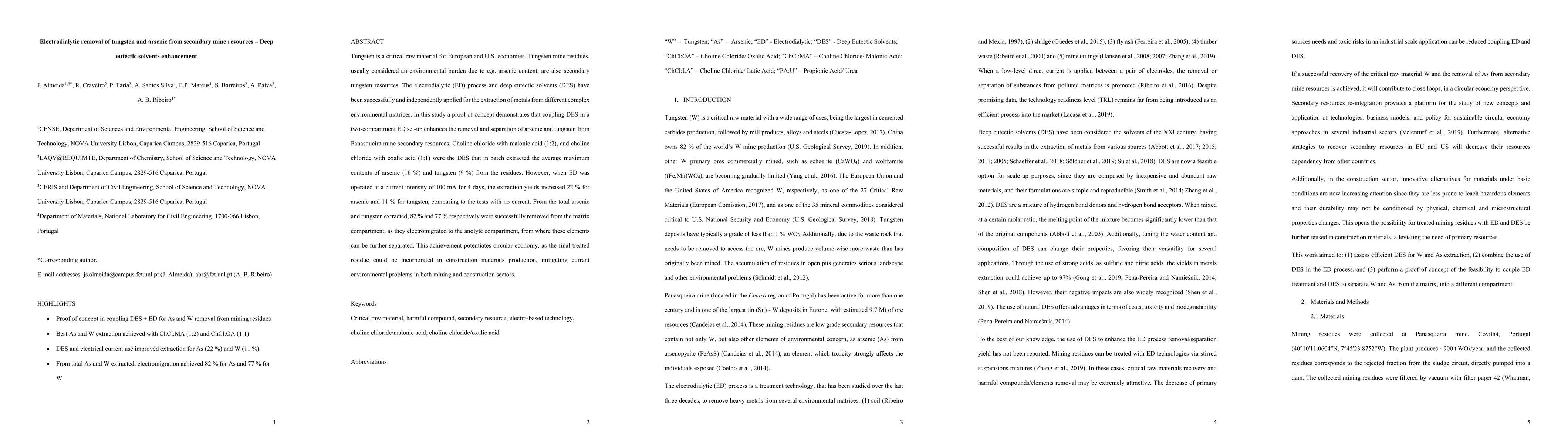 Tungsten is a critical raw material for European and U.S. economies. Tungsten mine residues, usually considered an environmental burden due to e.g. arsenic content, are also secondary tungsten resources. The electrodialytic (ED) process and deep eutectic solvents (DES) have been successfully and independently applied for the extraction of metals fromdifferent complex environmentalmatrices. In this study a proof of concept demonstrates that coupling DES in a two-compartment ED set-up enhances the removal and separation of arsenic and tungsten from Panasqueira mine secondary resources. Choline chloride with malonic acid (1:2), and choline chloride with oxalic acid (1:1) were the DES that in batch extracted the average maximum contents of arsenic (16%) and tungsten (9%) from the residues. However, when ED was operated at a current intensity of 100 mA for 4 days, the extraction yields increased 22% for arsenic and 11% for tungsten, comparing to the tests with no current. From the total arsenic and tungsten extracted, 82% and 77% respectively were successfully removed from the matrix compartment, as they electromigrated to the anolyte compartment, from where these elements can be further separated. This achievement potentiates circular economy, as the final treated residue could be incorporated in construction materials production, mitigating current environmental problems in both mining and construction sectors.