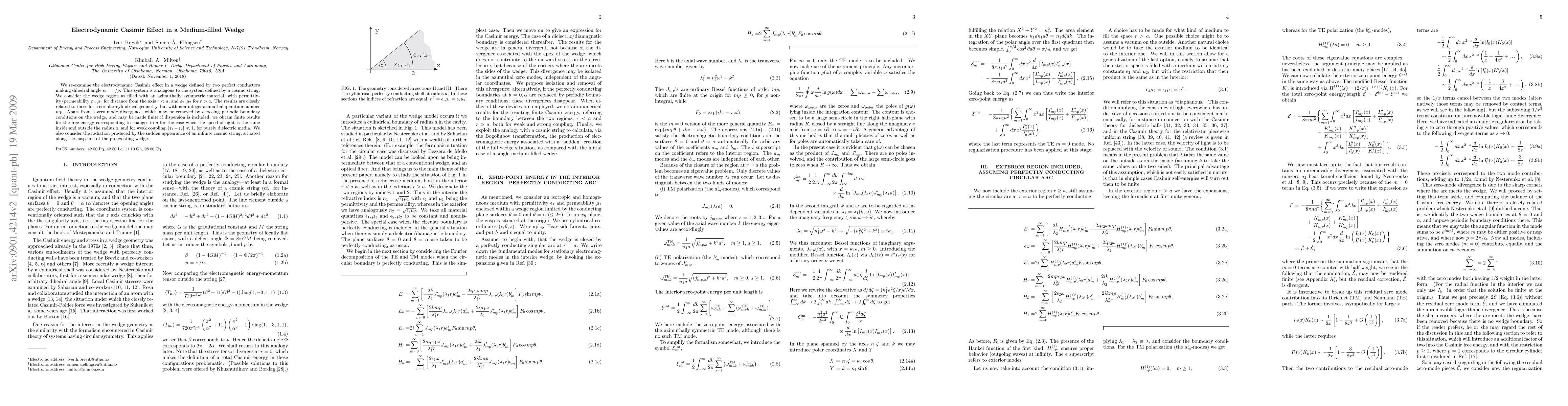We re-examine the electrodynamic Casimir effect in a wedge defined by two perfect conductors making dihedral angle \alpha=\pi/p. This system is analogous to the system defined by a cosmic string. We consider the wedge region as filled with an azimuthally symmetric material, with permittivity/permeability \epsilon_1,\mu_1 for distance from the axis ra. The results are closely related to those for a circular-cylindrical geometry, but with non-integer azimuthal quantum number mp. Apart from a zero-mode divergence, which may be removed by choosing periodic boundary conditions on the wedge, and may be made finite if dispersion is included, we obtain finite results for the free energy corresponding to changes in 'a' for the case when the speed of light is the same inside and outside the radius 'a', and for weak coupling, |\epsilon_1- \epsilon_2| \ll 1, for purely dielectric media. We also consider the radiation produced by the sudden appearance of an infinite cosmic string, situated along the cusp line of the pre-existing wedge.