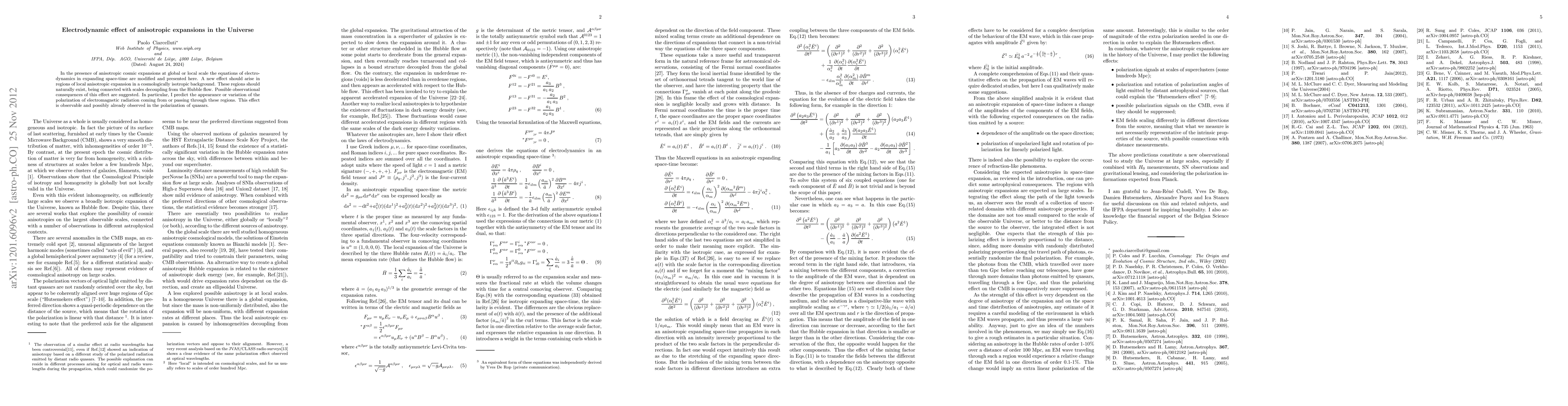 In the presence of anisotropic cosmic expansions at global or local scale the equations of electrodynamics in expanding space-time are modified and presented here. A new effect should arise in regions of local anisotropic expansion in a cosmologically isotropic background. These regions should naturally exist, being connected with scales decoupling from the Hubble flow. Possible observational consequences of this effect are suggested. In particular, I predict the appearance or variation of the polarization of electromagnetic radiation coming from or passing through these regions. This effect is observable and possibly already observed in the polarization of quasars.