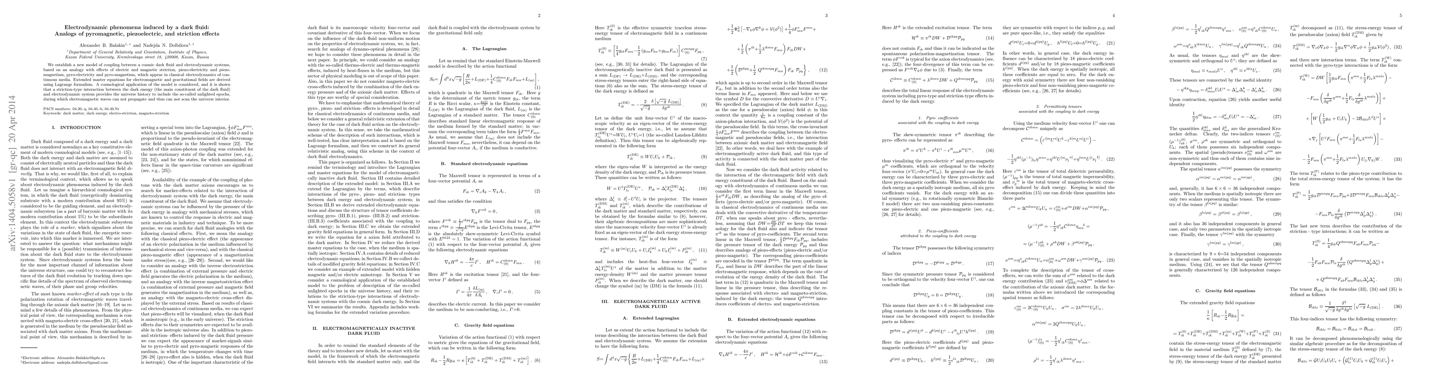 We establish a new model of coupling between a cosmic dark fluid and electrodynamic systems, based on an analogy with effects of electric and magnetic striction, piezo-electricity and piezo-magnetism, pyro-electricity and pyro-magnetism, which appear in classical electrodynamics of continuous media. Extended master equations for electromagnetic and gravitational fields are derived using Lagrange formalism. A cosmological application of the model is considered, and it is shown that a striction-type interaction between the dark energy (the main constituent of the dark fluid) and electrodynamic system provides the universe history to include the so-called unlighted epochs, during which electromagnetic waves can not propagate and thus can not scan the universe interior.