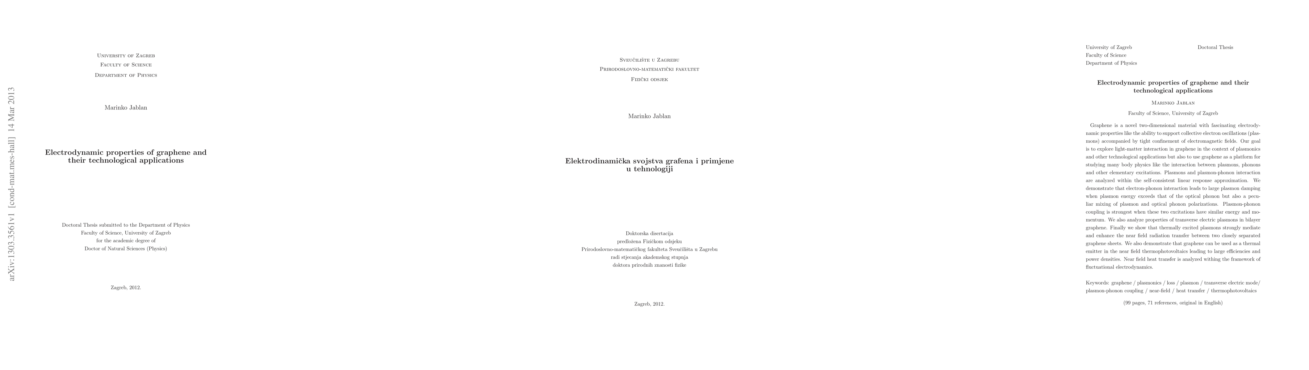 This paper explores the electrodynamic properties of graphene, particularly its plasmonic behavior and interactions with phonons, and discusses its technological applications in plasmonics and thermophotovoltaics. It highlights the strong coupling between plasmons and phonons, and the potential of graphene for enhancing near-field radiation transfer and thermal emission efficiency.