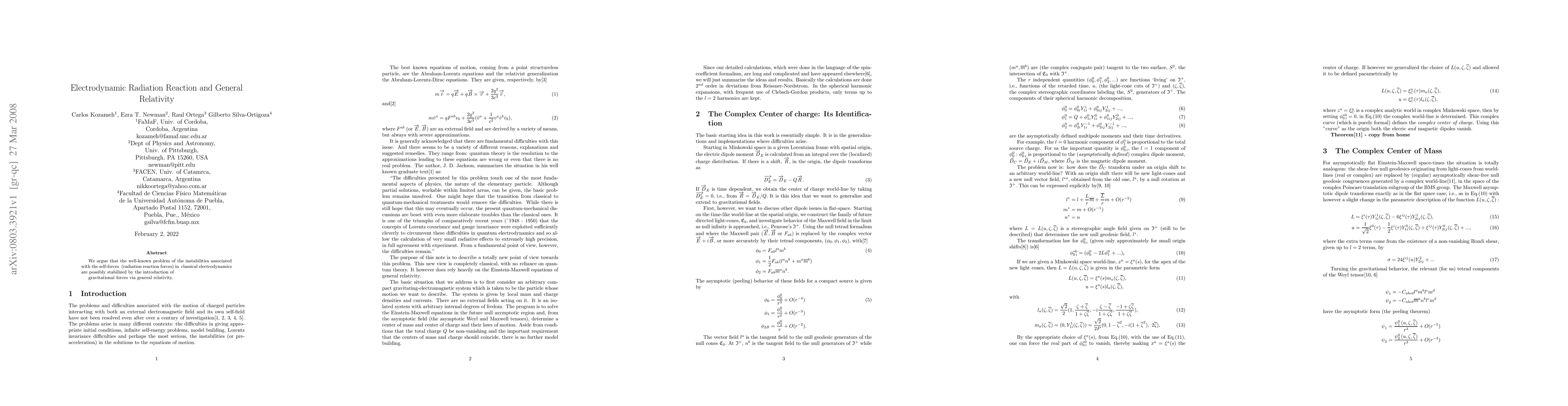 This paper explores whether gravitational forces from general relativity can stabilize the instabilities caused by radiation reaction forces in classical electrodynamics. It suggests that incorporating general relativity may resolve the problematic self-forces in classical electrodynamics.