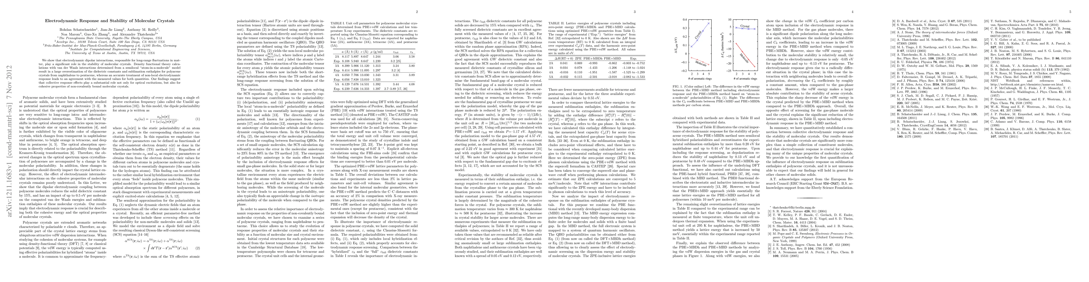 This paper demonstrates that electrodynamic dipolar interactions significantly influence the stability of molecular crystals, correcting overestimations in dielectric constants and sublimation enthalpies using accurate non-local electrodynamic response models, highlighting the importance of collective response effects for cohesive properties.