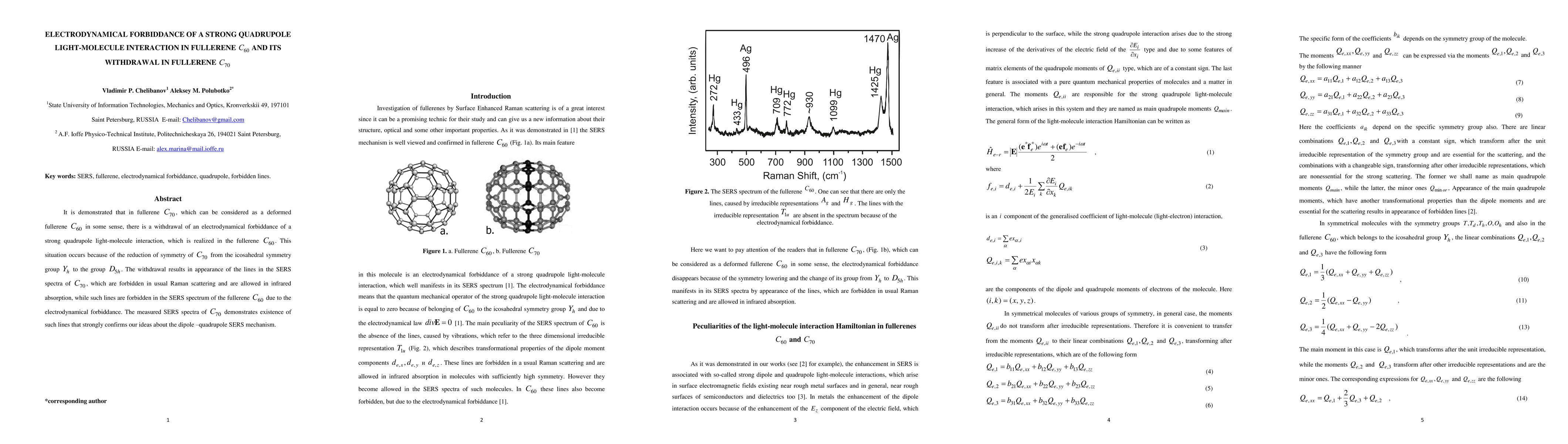 This paper demonstrates that the symmetry reduction in fullerene C70 from icosahedral to D5h leads to the withdrawal of an electrodynamical forbiddance of strong quadrupole light-molecule interactions, unlike in C60. This results in the appearance of forbidden lines in C70's SERS spectra, confirming the dipole quadrupole SERS mechanism.