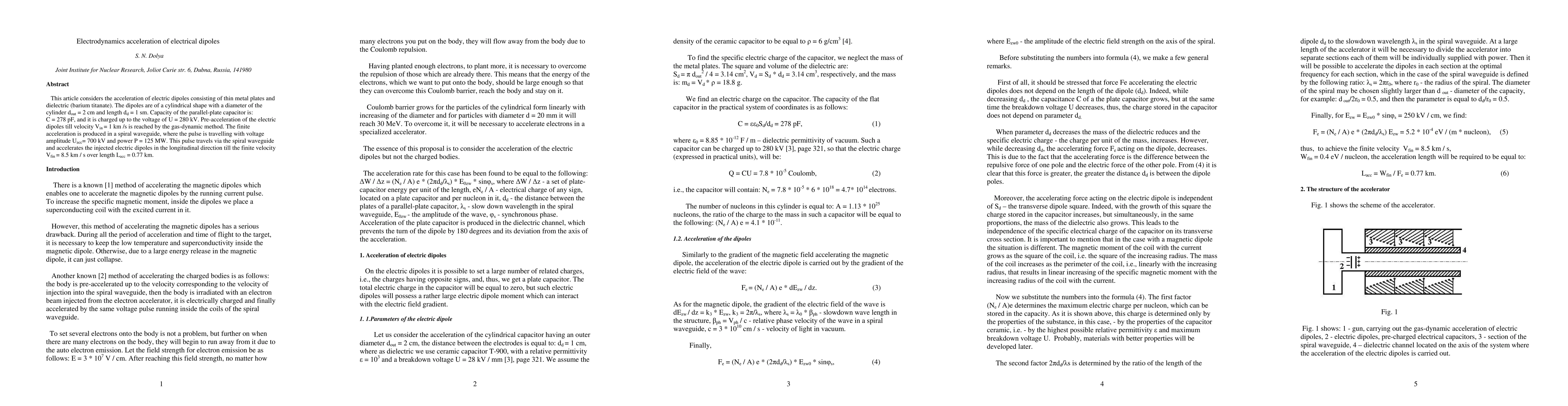 This article considers the acceleration of electric dipoles consisting of thin metal plates and dielectric (barium titanate). The dipoles are of a cylindrical shape with a diameter of the cylinder two centimeters and length one centimeter. Capacity of the parallel-plate capacitor is three hundred picofarads and it is charged up to the voltage of two hundred eighty kilovolts. Pre-acceleration of the electric dipoles till velocity one kilometer per second is reached by the gas-dynamic method. The finite acceleration is produced in a spiral waveguide, where the pulse is travelling with voltage amplitude seven hundreds kilovolts and power one hundred twenty-five megawatts. This pulse travels via the spiral waveguide and accelerates the injected electric dipoles in the longitudinal direction till the finite velocity eight and a half kilometers per second over length seven hundred and seventy meters.