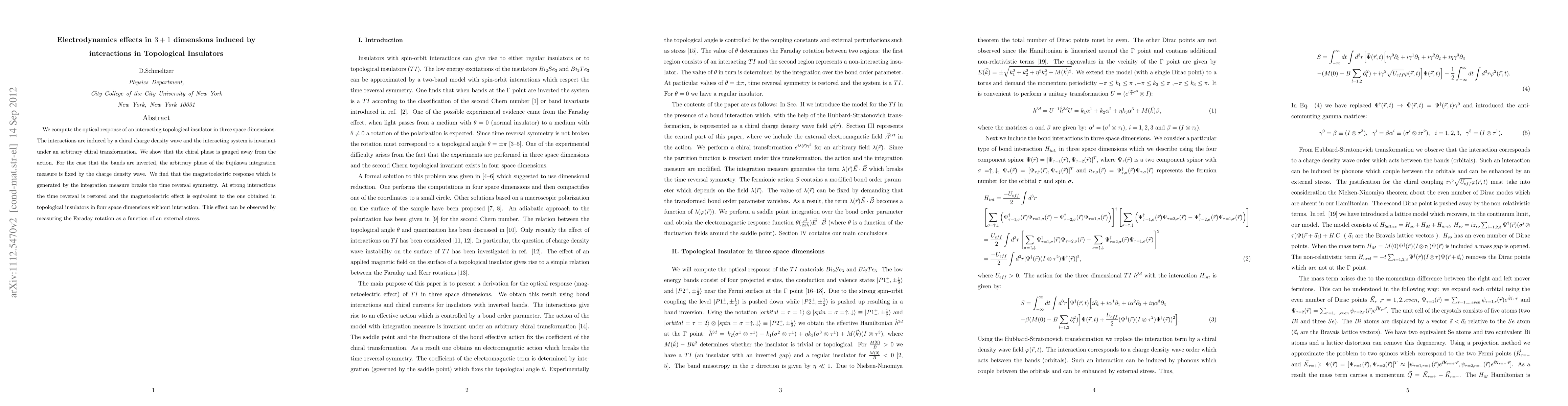 We investigate the effect of interactions in the Topological Insulator in 3+1 dimensions. We show that for a particular type of interactions, the Electrodynamics response is equivalent to the response of non-interacting Topological Insulator in 4+1 dimensions.