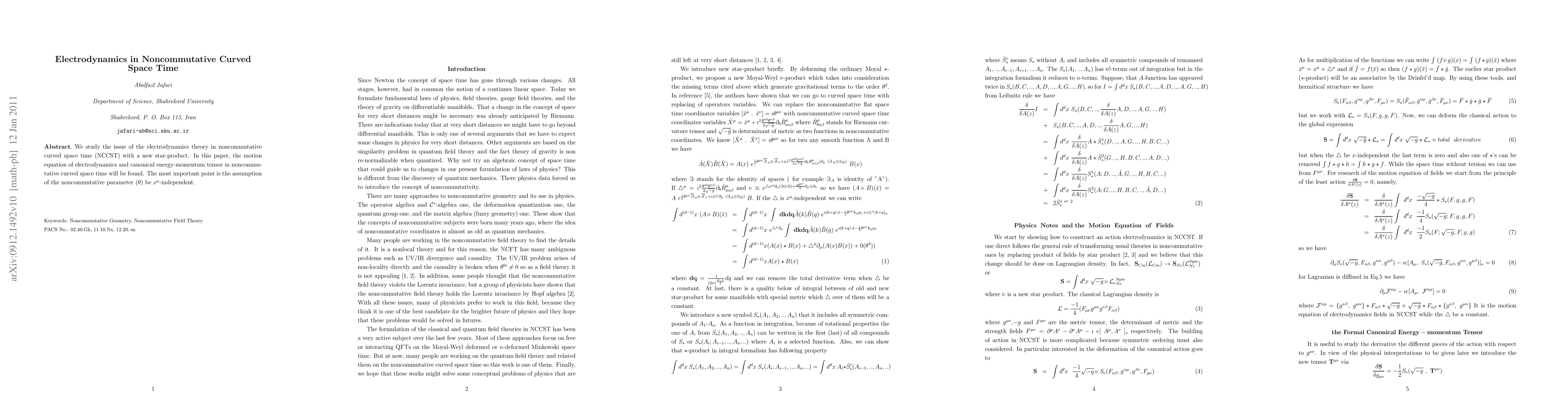 This paper investigates electrodynamics in noncommutative curved space time (NCCST) using a new star-product. It derives the motion equation and canonical energy-momentum tensor, assuming the noncommutative parameter $\theta$ is independent of $x^{\mu}$.