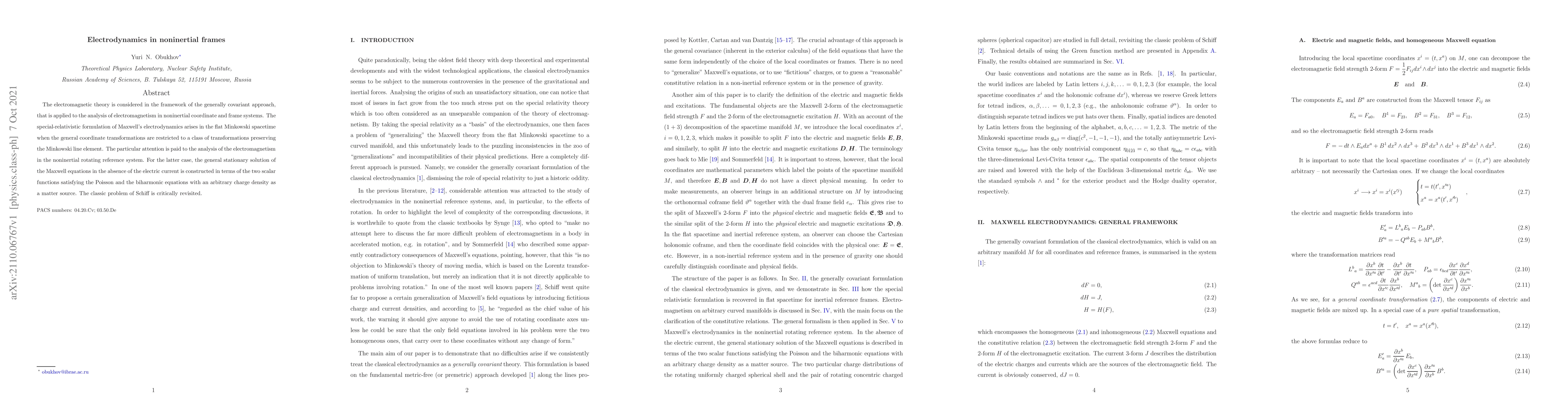 This paper explores electromagnetism in noninertial frames using a generally covariant approach, focusing on the special-relativistic formulation of Maxwell's equations in rotating reference systems. It constructs a stationary solution for the Maxwell equations in rotating frames, revisiting the classic Schiff problem.