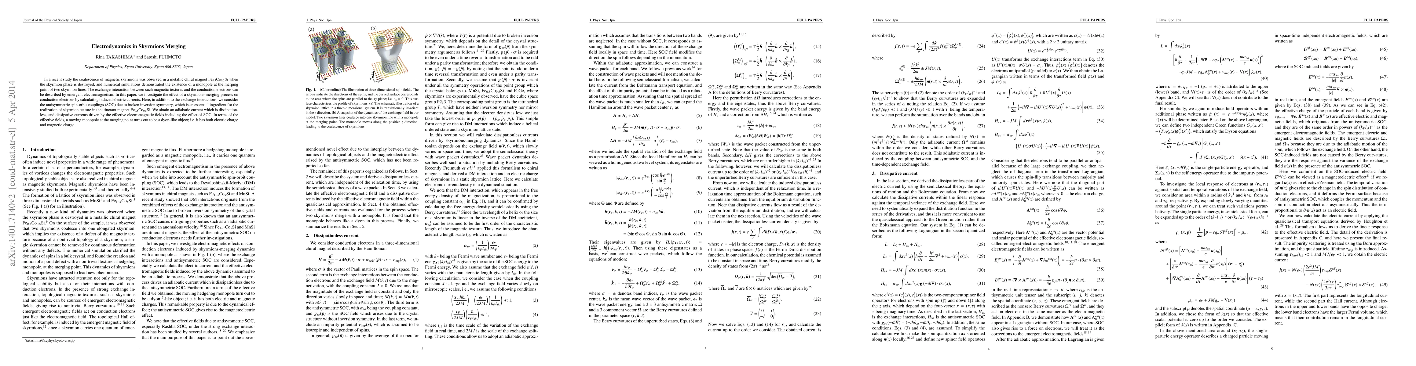 This study investigates the merging of magnetic skyrmions in Fe0.5Co0.5Si, observing induced electric currents due to the exchange interaction and antisymmetric spin-orbit couplings. The merging process generates both adiabatic and dissipative currents, with the moving monopole at the merging point behaving as a dyon with both electric and magnetic charge.