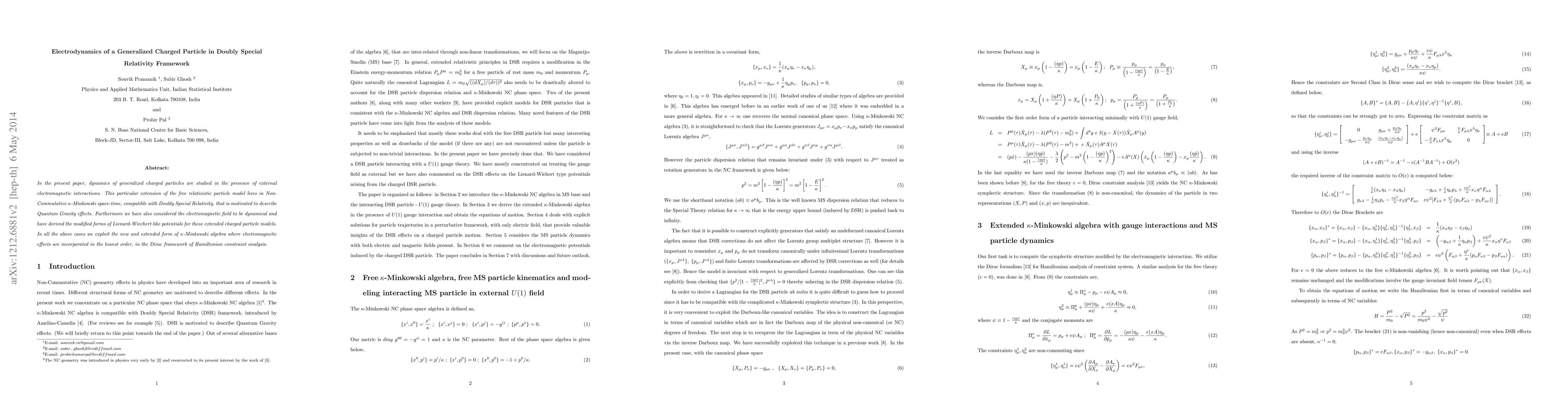 In the present paper, dynamics of generalized charged particles are studied in the presence of external electromagnetic interactions. This particular extension of the free relativistic particle model lives in Non-Commutative $\kappa$-Minkowski space-time, compatible with Doubly Special Relativity, that is motivated to describe Quantum Gravity effects. Furthermore we have also considered the electromagnetic field to be dynamical and have derived the modified forms of Lienard-Wiechert like potentials for these extended charged particle models. In all the above cases we exploit the new and extended form of $\kappa$-Minkowski algebra where electromagnetic effects are incorporated in the lowest order, in the Dirac framework of Hamiltonian constraint analysis.