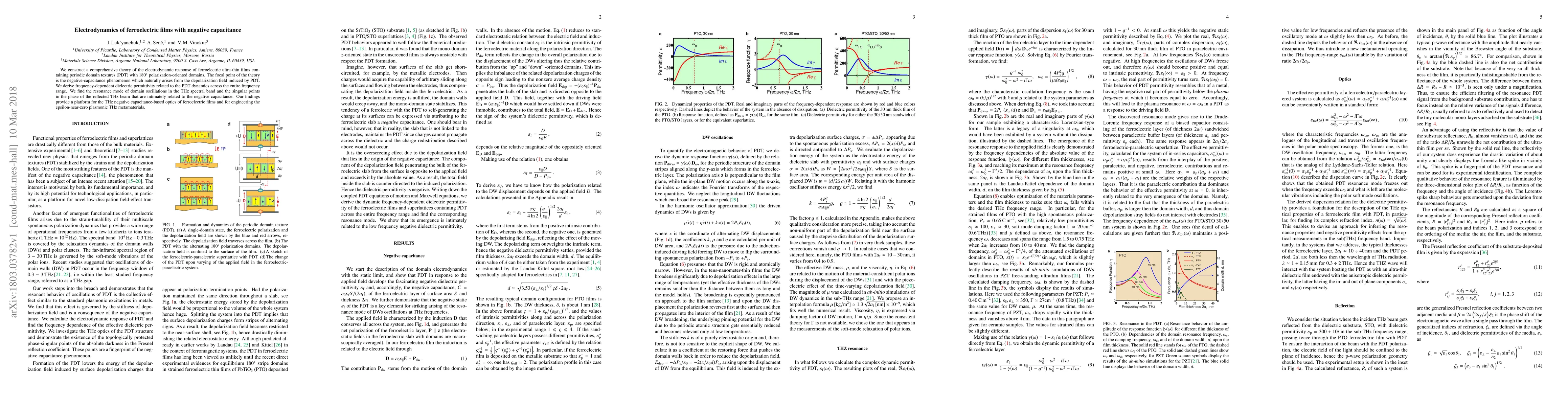 This paper develops a theoretical framework for the electrodynamic behavior of ferroelectric ultra-thin films with periodic domain textures, highlighting the negative capacitance phenomenon arising from depolarization fields. It identifies THz resonance modes and singular points in reflected THz beams linked to negative capacitance, paving the way for advanced THz optics and metamaterial engineering.