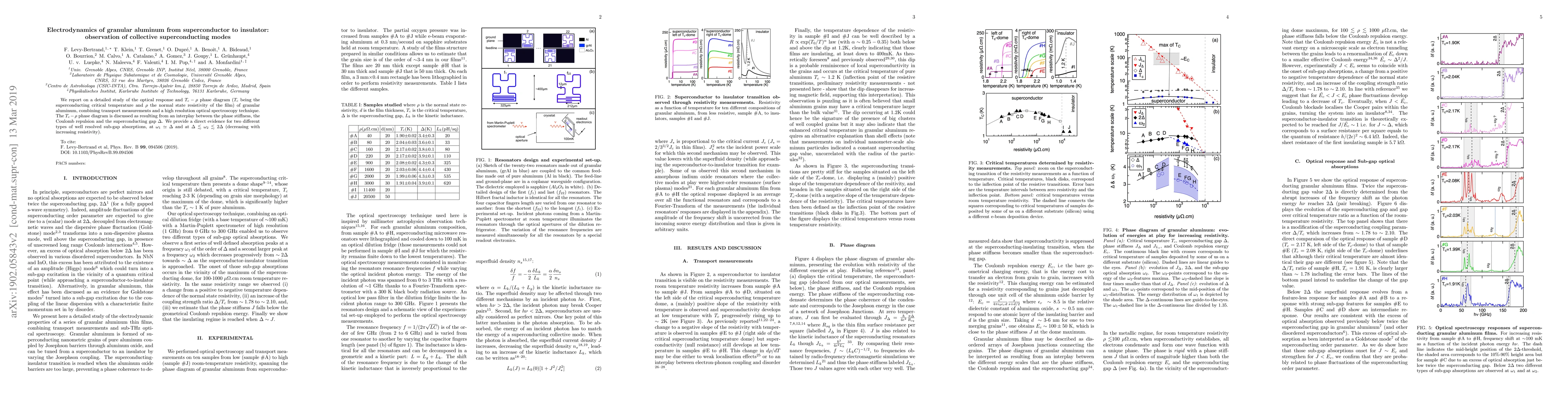 This study investigates the optical response and $T_c-\rho$ phase diagram of granular aluminum, revealing collective superconducting modes. The research combines transport measurements and high-resolution optical spectroscopy, providing evidence for two distinct sub-gap absorptions linked to the superconducting gap and Coulomb repulsion.