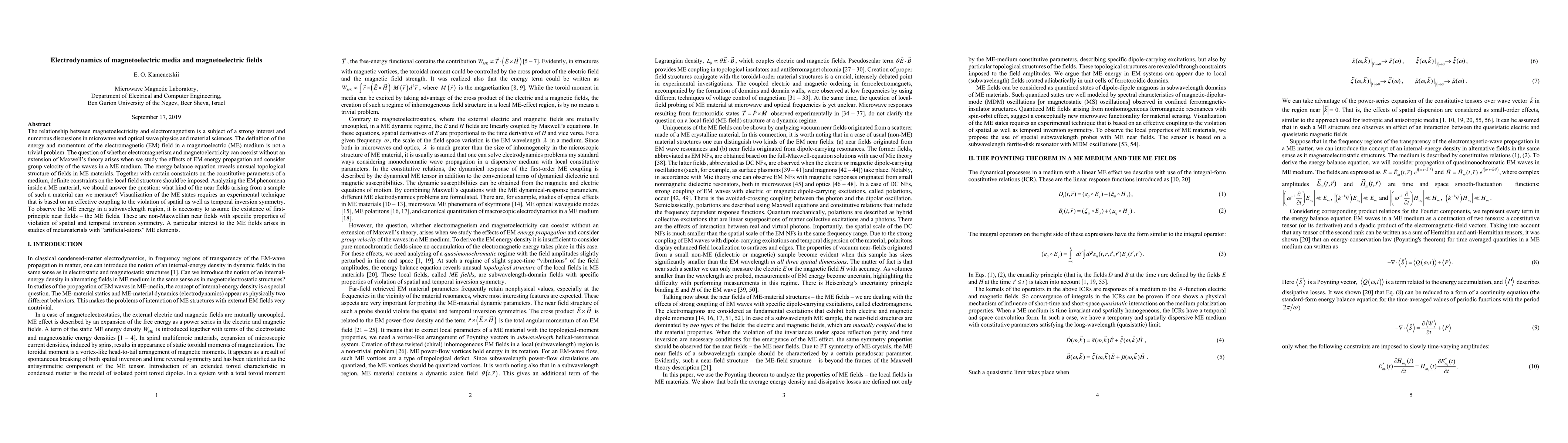 The relationship between magnetoelectricity and electromagnetism is a subject of a strong interest and numerous discussions in microwave and optical wave physics and material sciences. The definition of the energy and momentum of the electromagnetic (EM) field in a magnetoelectric (ME) medium is not a trivial problem. The question of whether electromagnetism and magnetoelectricity can coexist without an extension of Maxwell theory arises when we study the effects of EM energy propagation and consider group velocity of the waves in a ME medium. The energy balance equation reveals unusual topological structure of fields in ME materials. Together with certain constraints on the constitutive parameters of a medium, definite constraints on the local field structure should be imposed. Analyzing the EM phenomena inside a ME material, we should answer the question: what kind of the near fields arising from a sample of such a material can we measure? Visualization of the ME states requires an experimental technique that is based on an effective coupling to the violation of spatial as well as temporal inversion symmetry. To observe the ME energy in a subwavelength region, it is necessary to assume the existence of first principle near fields, the ME fields. These are non Maxwellian near fields with specific properties of violation of spatial and temporal inversion symmetry. A particular interest to the ME fields arises in studies of metamaterials with artificial atoms ME elements.