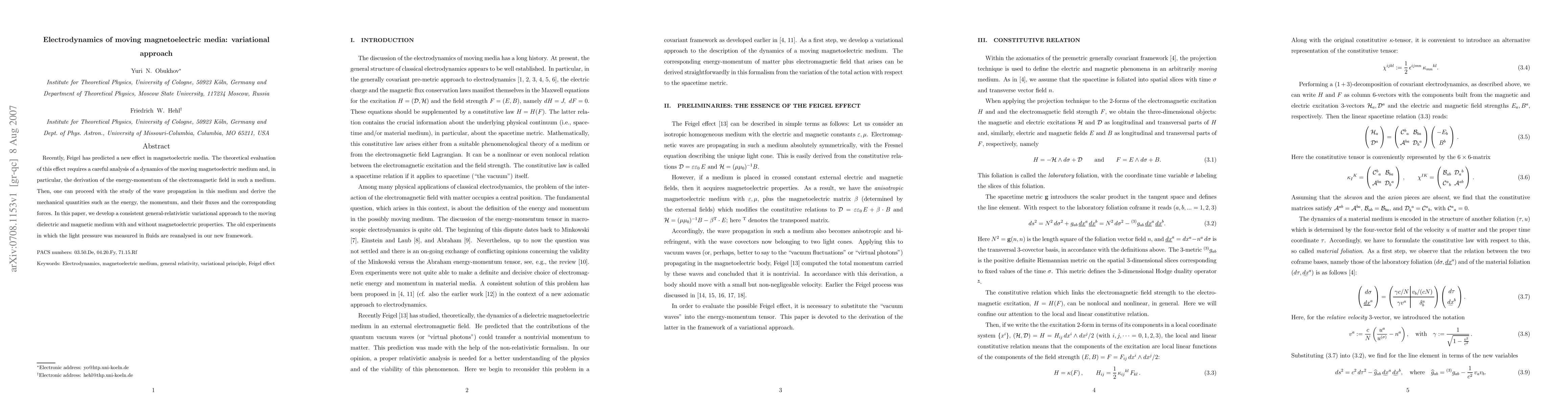 Recently, Feigel has predicted a new effect in magnetoelectric media. The theoretical evaluation of this effect requires a careful analysis of a dynamics of the moving magnetoelectric medium and, in particular, the derivation of the energy-momentum of the electromagnetic field in such a medium. Then, one can proceed with the study of the wave propagation in this medium and derive the mechanical quantities such as the energy, the momentum, and their fluxes and the corresponding forces. In this paper, we develop a consistent general-relativistic variational approach to the moving dielectric and magnetic medium with and without magnetoelectric properties. The old experiments in which the light pressure was measured in fluids are reanalysed in our new framework.