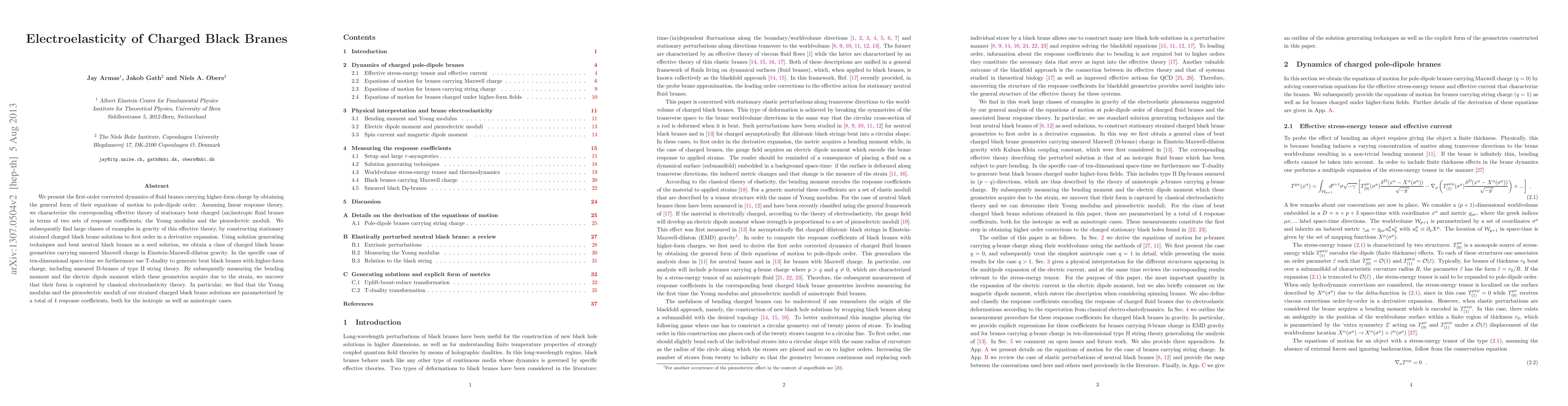 We present the first-order corrected dynamics of fluid branes carrying higher-form charge by obtaining the general form of their equations of motion to pole-dipole order. Assuming linear response theory, we characterize the corresponding effective theory of stationary bent charged (an)isotropic fluid branes in terms of two sets of response coefficients, the Young modulus and the piezoelectric moduli. We subsequently find large classes of examples in gravity of this effective theory, by constructing stationary strained charged black brane solutions to first order in a derivative expansion. Using solution generating techniques and bent neutral black branes as a seed solution, we obtain a class of charged black brane geometries carrying smeared Maxwell charge in Einstein-Maxwell-dilaton gravity. In the specific case of ten-dimensional space-time we furthermore use T-duality to generate bent black branes with higher-form charge, including smeared D-branes of type II string theory. By subsequently measuring the bending moment and the electric dipole moment which these geometries acquire due to the strain, we uncover that their form is captured by classical electroelasticity theory. In particular, we find that the Young modulus and the piezoelectric moduli of our strained charged black brane solutions are parameterized by a total of 4 response coefficients, both for the isotropic as well as anisotropic cases.