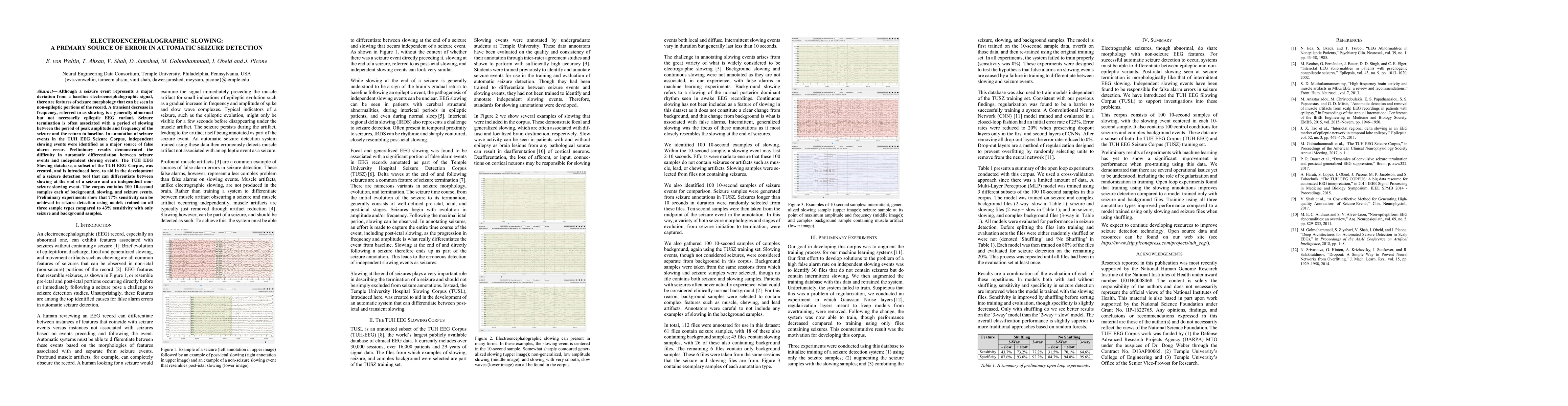 Although a seizure event represents a major deviation from a baseline electroencephalographic signal, there are features of seizure morphology that can be seen in non-epileptic portions of the record. A transient decrease in frequency, referred to as slowing, is a generally abnormal but not necessarily epileptic EEG variant. Seizure termination is often associated with a period of slowing between the period of peak amplitude and frequency of the seizure and the return to baseline. In annotation of seizure events in the TUH EEG Seizure Corpus, independent slowing events were identified as a major source of false alarm error. Preliminary results demonstrated the difficulty in automatic differentiation between seizure events and independent slowing events. The TUH EEG Slowing database, a subset of the TUH EEG Corpus, was created, and is introduced here, to aid in the development of a seizure detection tool that can differentiate between slowing at the end of a seizure and an independent non-seizure slowing event. The corpus contains 100 10-second samples each of background, slowing, and seizure events. Preliminary experiments show that 77% sensitivity can be achieved in seizure detection using models trained on all three sample types compared to 43% sensitivity with only seizure and background samples.