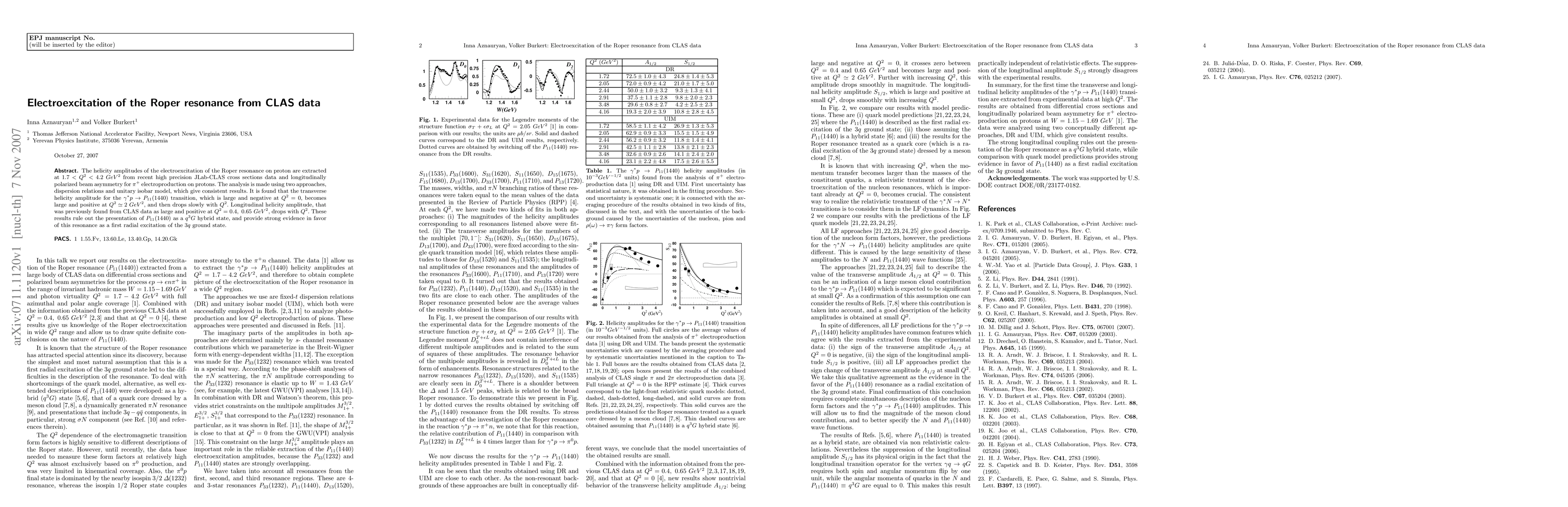 This study extracts the helicity amplitudes for the electroexcitation of the Roper resonance from JLab-CLAS data, revealing a transition in the transverse helicity amplitude from negative to positive at higher Q2 values. The findings support the Roper resonance as a first radial excitation of the 3q ground state rather than a hybrid state.