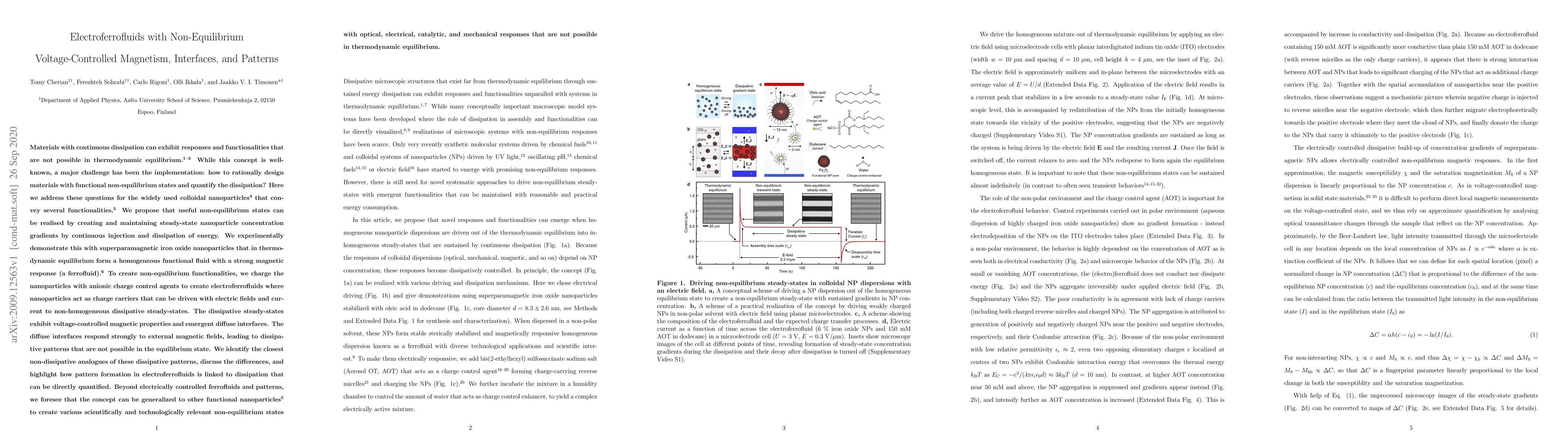 Materials with continuous dissipation can exhibit responses and functionalities that are not possible in thermodynamic equilibrium. While this concept is well-known, a major challenge has been the implementation: how to rationally design materials with functional non-equilibrium states and quantify the dissipation? Here we address these questions for the widely used colloidal nanoparticles that convey several functionalities. We propose that useful non-equilibrium states can be realised by creating and maintaining steady-state nanoparticle concentration gradients by continuous injection and dissipation of energy. We experimentally demonstrate this with superparamagnetic iron oxide nanoparticles that in thermodynamic equilibrium form a homogeneous functional fluid with a strong magnetic response (a ferrofluid). To create non-equilibrium functionalities, we charge the nanoparticles with anionic charge control agents to create electroferrofluids where nanoparticles act as charge carriers that can be driven with electric fields and current to non-homogeneous dissipative steady-states. The dissipative steady-states exhibit voltage-controlled magnetic properties and emergent diffuse interfaces. The diffuse interfaces respond strongly to external magnetic fields, leading to dissipative patterns that are not possible in the equilibrium state. We identify the closest non-dissipative analogues of these dissipative patterns, discuss the differences, and highlight how pattern formation in electroferrofluids is linked to dissipation that can be directly quantified. Beyond electrically controlled ferrofluids and patterns, we foresee that the concept can be generalized to other functional nanoparticles to create various scientifically and technologically relevant non-equilibrium states with optical, electrical, catalytic, and mechanical responses that are not possible in thermodynamic equilibrium.
