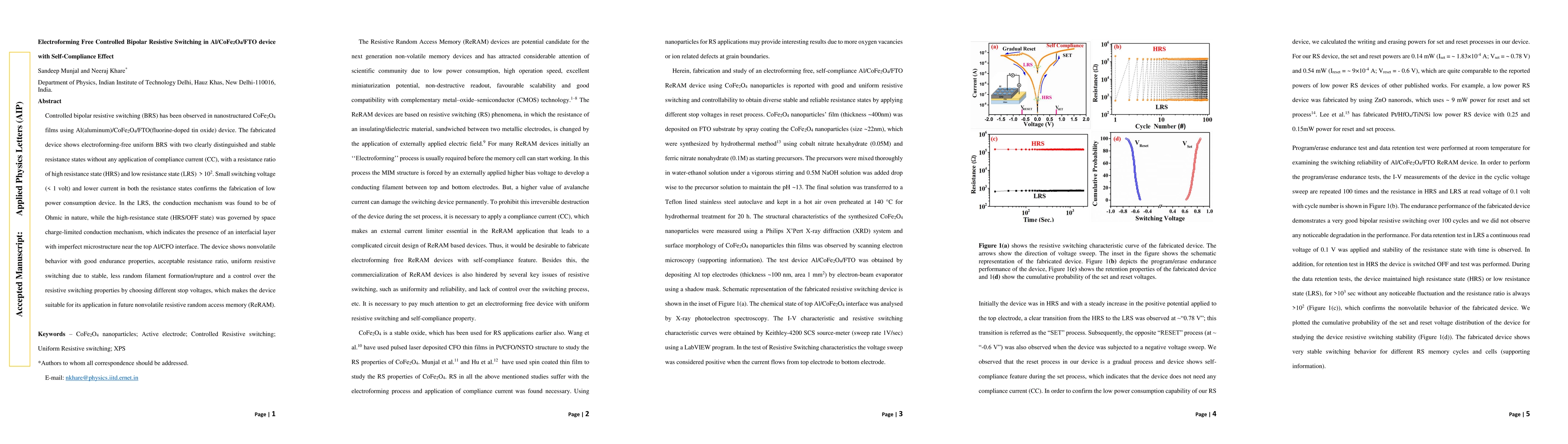 This research paper reports on an electroforming-free controlled bipolar resistive switching in an Al/CoFe2O4/FTO device, showing uniform resistive switching with two stable states and a high resistance ratio. The device exhibits low power consumption and nonvolatile behavior, suitable for future resistive random access memory applications.