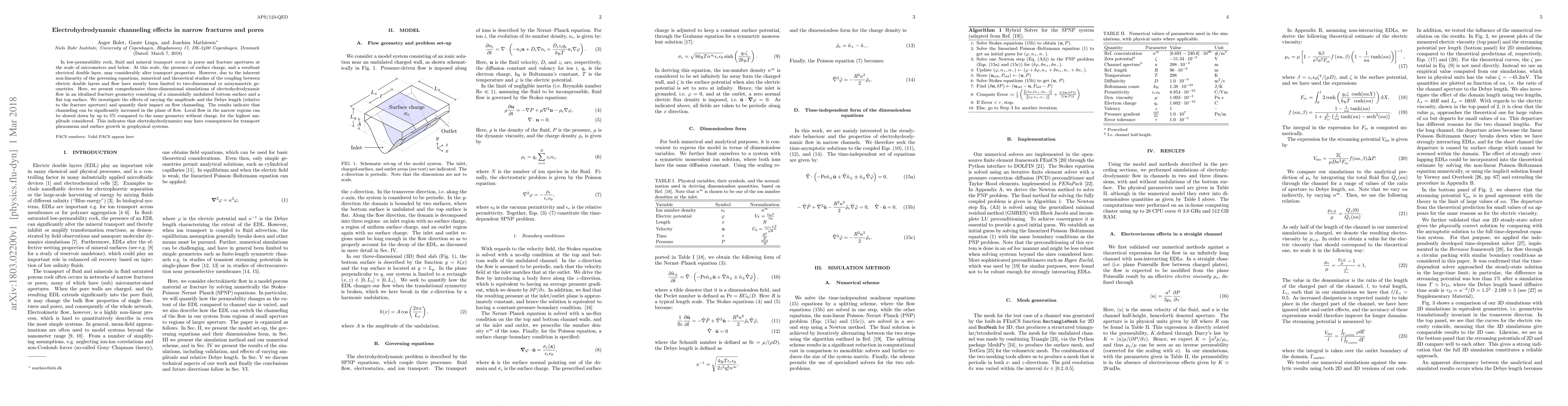 This research presents three-dimensional simulations revealing that electrohydrodynamic effects can significantly enhance flow channeling in narrow, sinusoidally undulated fractures within low-permeability rocks, potentially slowing local flow by up to 5% for high charge amplitudes, with implications for transport and surface growth in geophysical systems.