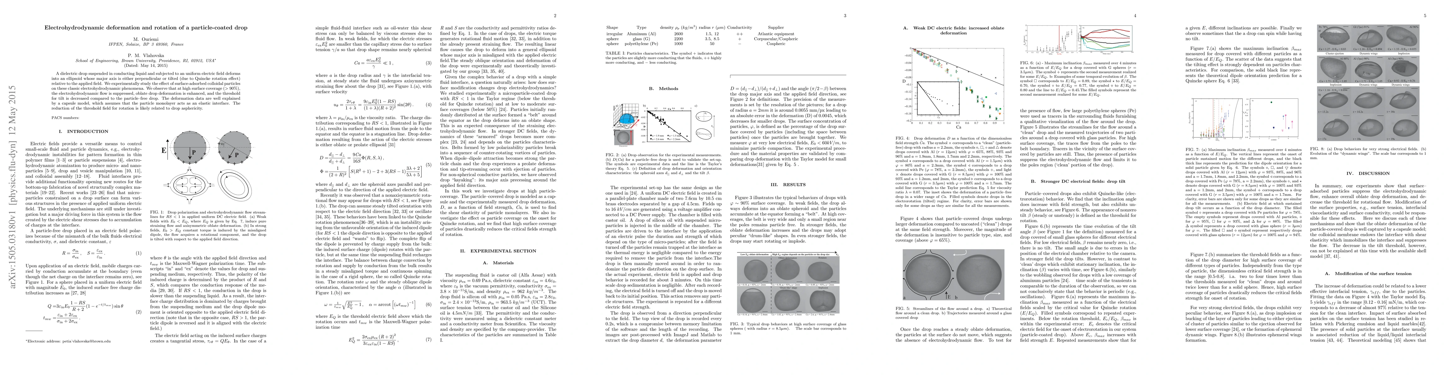 This study investigates how surface-adsorbed colloidal particles affect the electrohydrodynamic deformation and rotation of a dielectric drop in a conducting liquid. High surface coverage of particles suppresses electrohydrodynamic flow, enhances oblate deformation, and reduces the threshold for rotation, effects explained by a capsule model considering the particle monolayer as an elastic interface.