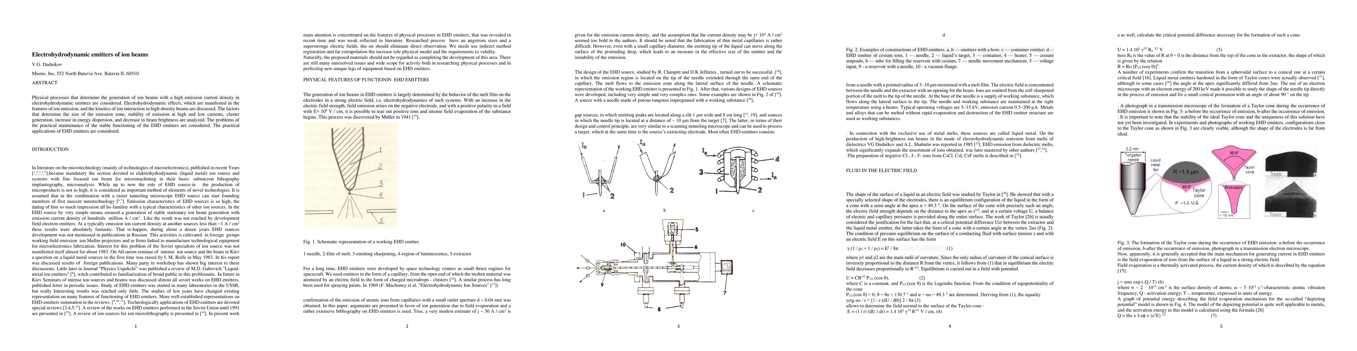 Physical processes that determine the generation of ion beams with a high emission current density in electrohydrodynamic emitters are considered. Electrohydrodynamic effects, which are manifested in the features of ion emission, and the kinetics of ion interaction in high-density beams are discussed. The factors that determine the size of the emission zone, stability of emission at high and low currents, cluster generation, increase in energy dispersion, and decrease in beam brightness are analyzed. The problems of the practical maintenance of the stable functioning of the EHD emitters are considered. The practical applications of EHD emitters are considered.