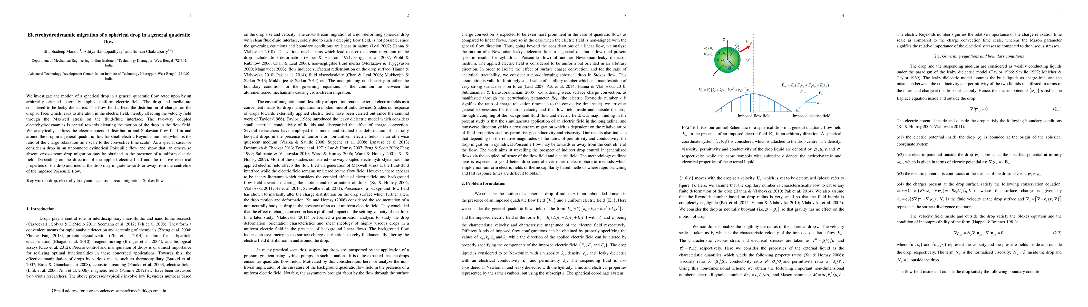 We investigate the motion of a spherical drop in a general quadratic flow acted upon by an arbitrarily oriented externally applied uniform electric field. The drop and media are considered to be leaky dielectrics. The flow field affects the distribution of charges on the drop surface, which leads to alteration in the electric field, thereby affecting the velocity field through the Maxwell stress on the fluid-fluid interface. The two-way coupled electrohydrodynamics is central towards dictating the motion of the drop in the flow field. We analytically address the electric potential distribution and Stokesian flow field in and around the drop in a general quadratic flow for small electric Reynolds number (which is the ratio of the charge relaxation time scale to the convective time scale). As a special case, we consider a drop in an unbounded cylindrical Poiseuille flow and show that, an otherwise absent, cross-stream drop migration may be obtained in the presence of a uniform electric field. Depending on the direction of the applied electric field and the relative electrical properties of the drop and media, the drop may migrate towards or away from the centreline of the imposed Poiseuille flow.