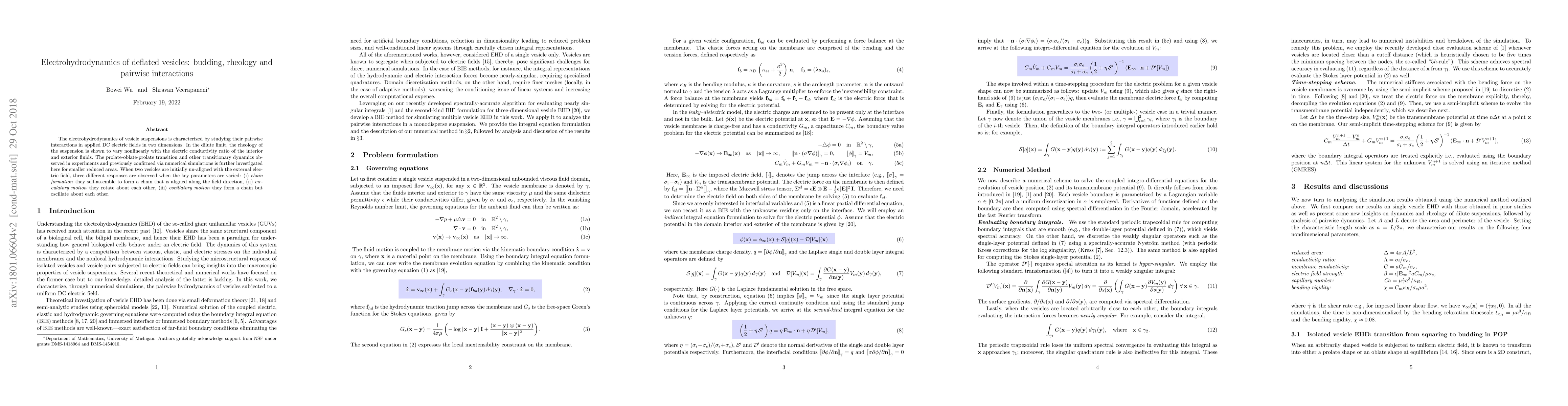 This paper investigates the electrohydrodynamics of deflated vesicle suspensions under DC electric fields, focusing on their nonlinear rheology and pairwise interactions. The study reveals three distinct vesicle behaviors: chain formation, circulatory motion, and oscillatory motion, depending on the applied parameters.