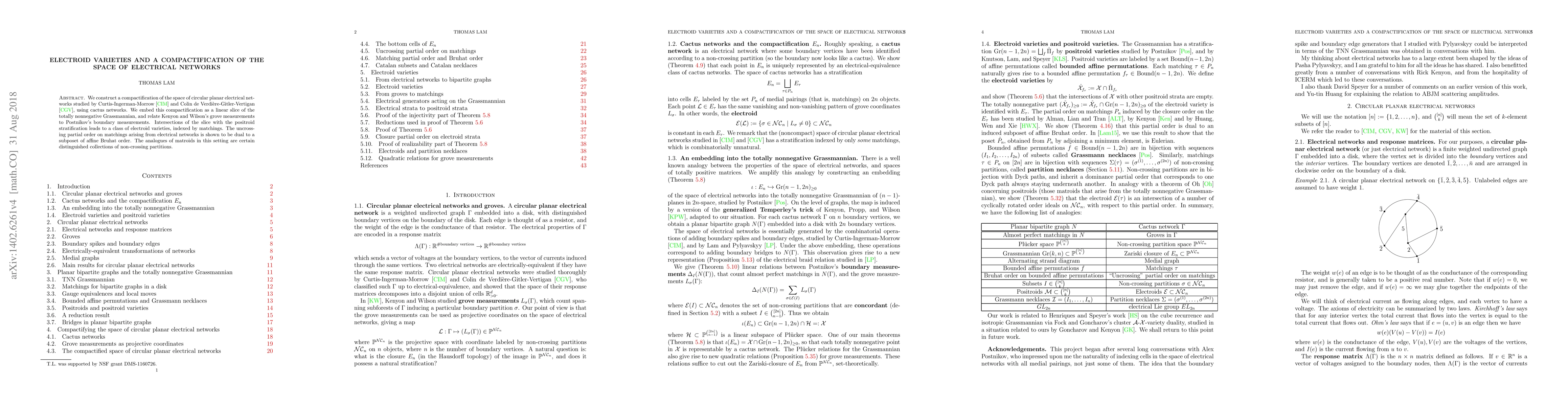 This research constructs a compactification of the space of circular planar electrical networks using cactus networks, embedding it in the totally nonnegative Grassmannian. It introduces electroid varieties indexed by matchings, relates grove and boundary measurements, and shows the partial order on matchings is dual to a subposet of affine Bruhat order. The analogues of matroids in this context are distinguished collections of non-crossing partitions.