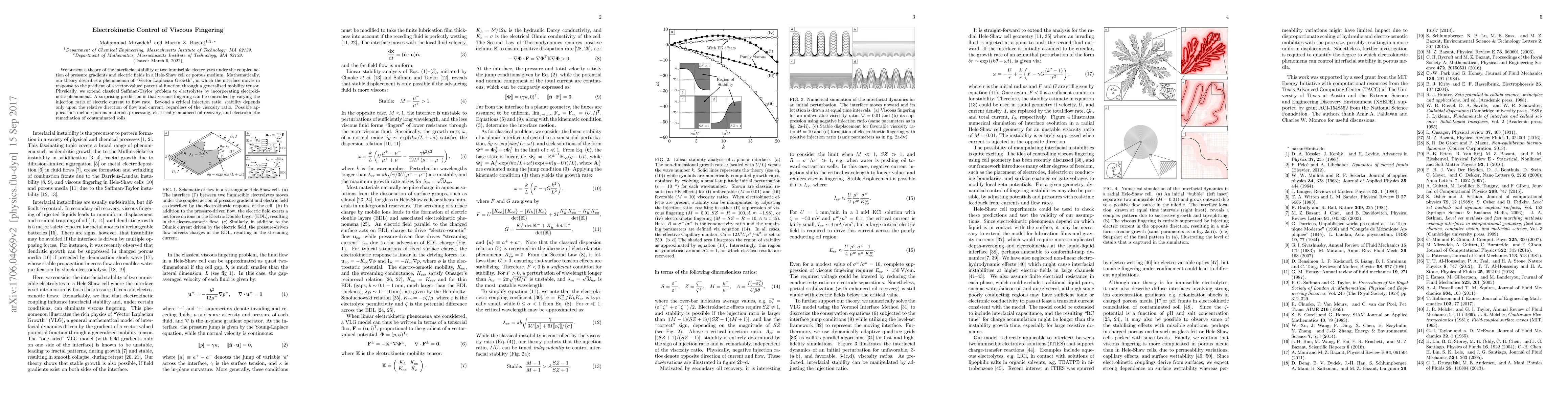 We present a theory of the interfacial stability of two immiscible electrolytes under the coupled action of pressure gradients and electric fields in a Hele-Shaw cell or porous medium. Mathematically, our theory describes a phenomenon of "Vector Laplacian Growth", in which the interface moves in response to the gradient of a vector-valued potential function through a generalized mobility tensor. Physically, we extend classical Saffman-Taylor problem to electrolytes by incorporating electrokinetic phenomena. A surprising prediction is that viscous fingering can be controlled by varying the injection ratio of electric current to flow rate. Beyond a critical injection ratio, stability depends only upon the relative direction of flow and current, regardless of the viscosity ratio. Possible applications include porous materials processing, electrically enhanced oil recovery, and electrokinetic remediation of contaminated soils.