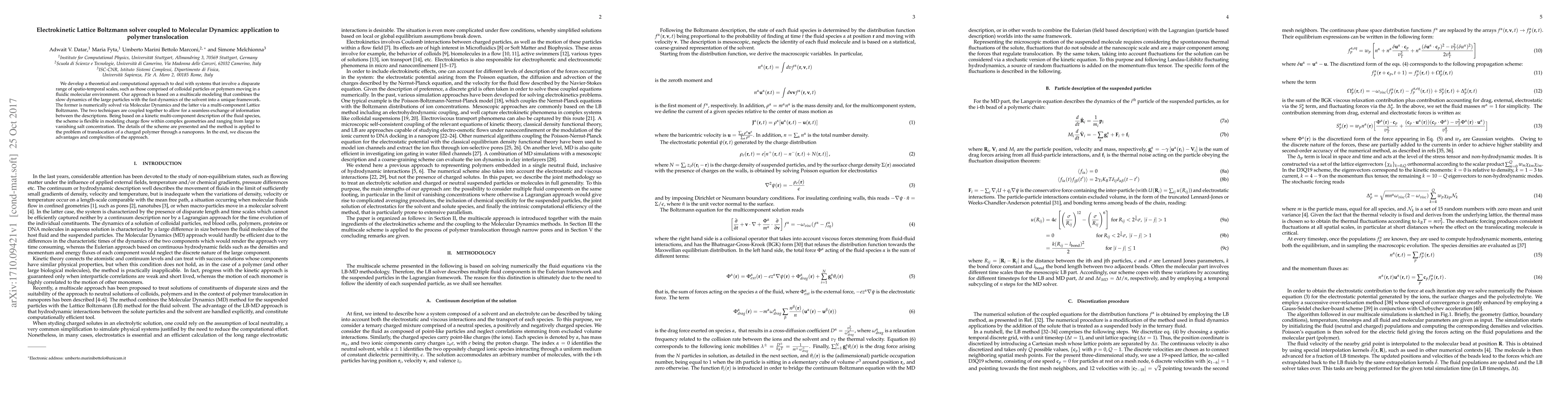 We develop a theoretical and computational approach to deal with systems that involve a disparate range of spatio-temporal scales, such as those comprised of colloidal particles or polymers moving in a fluidic molecular environment. Our approach is based on a multiscale modeling that combines the slow dynamics of the large particles with the fast dynamics of the solvent into a unique framework. The former is numerically solved via Molecular Dynamics and the latter via a multi-component Lattice Boltzmann. The two techniques are coupled together to allow for a seamless exchange of information between the descriptions. Being based on a kinetic multi-component description of the fluid species, the scheme is flexible in modeling charge flow within complex geometries and ranging from large to vanishing salt concentration. The details of the scheme are presented and the method is applied to the problem of translocation of a charged polymer through a nanopores. In the end, we discuss the advantages and complexities of the approach.