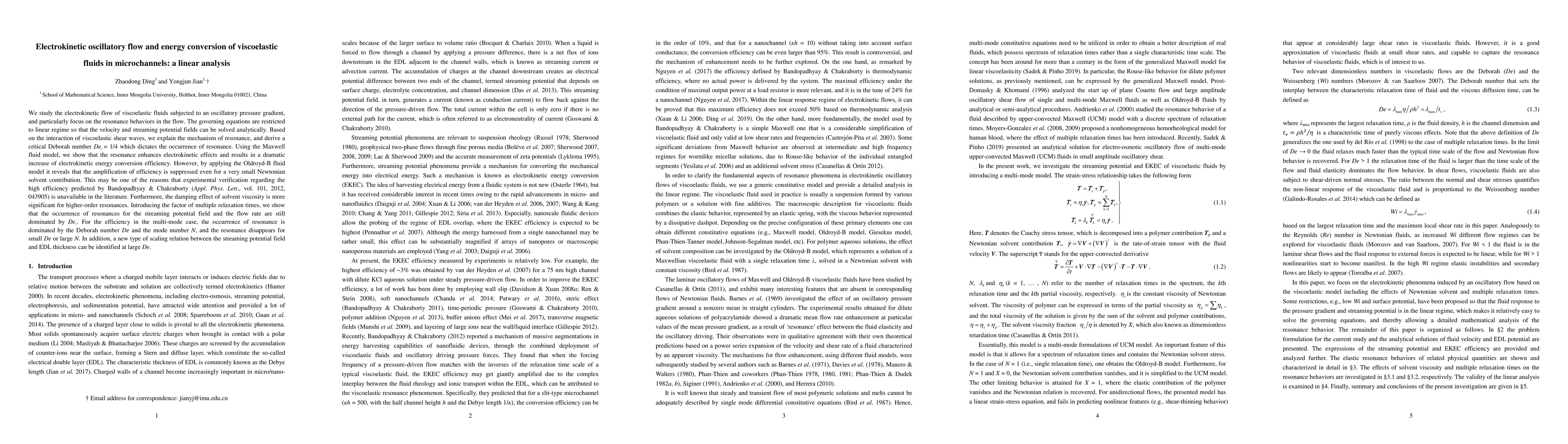 This paper investigates the electrokinetic oscillatory flow of viscoelastic fluids in microchannels under an oscillatory pressure gradient, focusing on resonance behaviors and energy conversion efficiency. It finds that resonance enhances electrokinetic effects for Maxwell fluids but not for Oldroyd-B fluids, explaining discrepancies in experimental results.