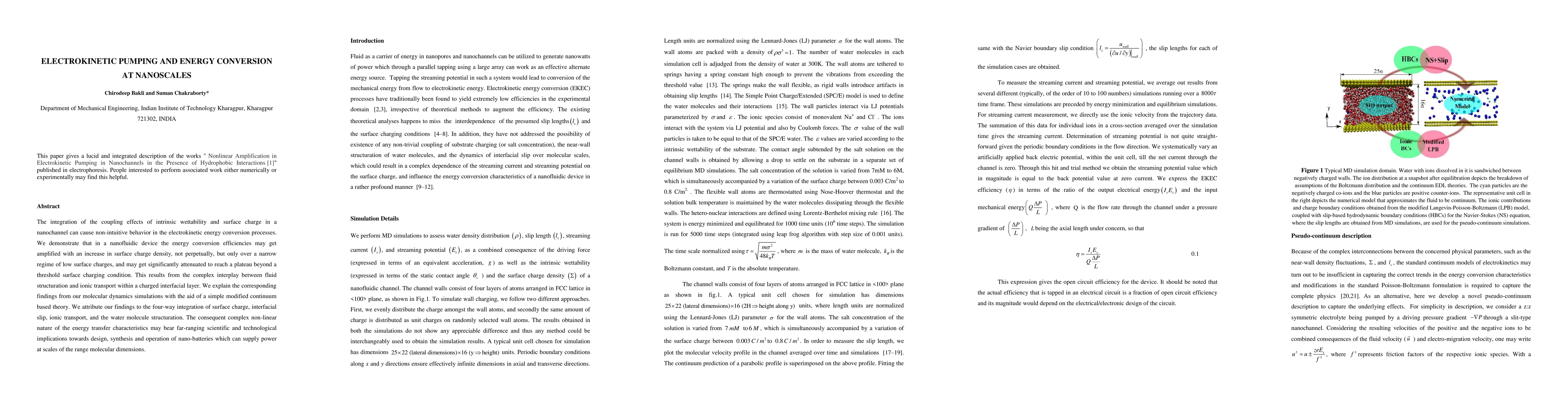 This research reveals that energy conversion efficiencies in nanofluidic devices peak at low surface charge densities and plateau beyond a threshold, due to complex interactions between fluid structuration, ionic transport, and surface charge. Findings, supported by molecular dynamics simulations and a modified continuum theory, suggest implications for designing nano-scale energy storage devices.