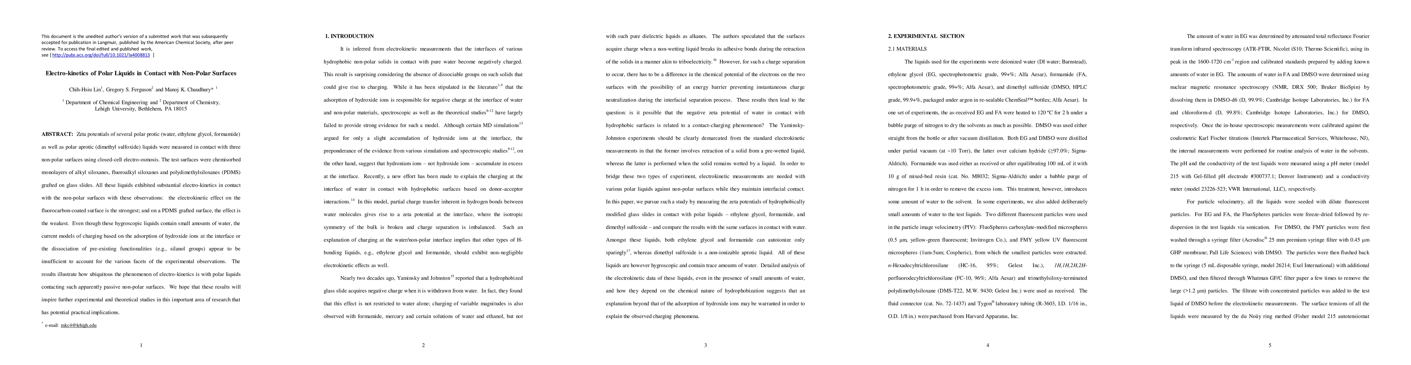 The paper presents a method to measure zeta potentials of polar liquids on non-polar surfaces using closed-cell electro-osmosis, providing insights into electro-kinetic effects in non-aqueous systems.