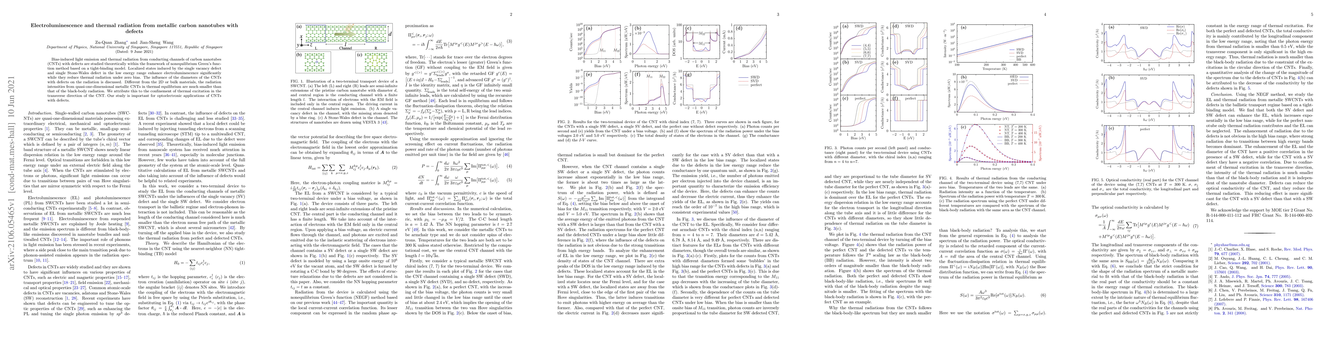 This paper investigates the electroluminescence and thermal radiation from metallic carbon nanotubes with defects using a nonequilibrium Green's function method. It finds that defects enhance electroluminescence while reducing thermal radiation, with diameter-dependent effects, and highlights the potential for optoelectronic applications of such nanotubes.