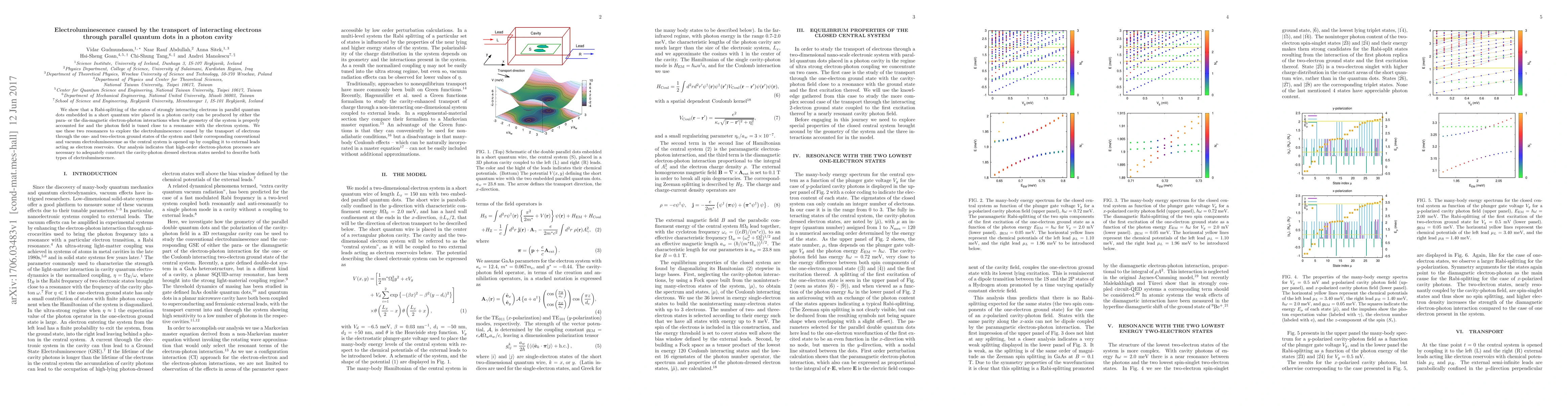 We show that a Rabi-splitting of the states of strongly interacting electrons in parallel quantum dots embedded in a short quantum wire placed in a photon cavity can be produced by either the para- or the dia-magnetic electron-photon interactions when the geometry of the system is properly accounted for and the photon field is tuned close to a resonance with the electron system. We use these two resonances to explore the electroluminescence caused by the transport of electrons through the one- and two-electron ground states of the system and their corresponding conventional and vacuum electroluminescense as the central system is opened up by coupling it to external leads acting as electron reservoirs. Our analysis indicates that high-order electron-photon processes are necessary to adequately construct the cavity-photon dressed electron states needed to describe both types of electroluminescence.
