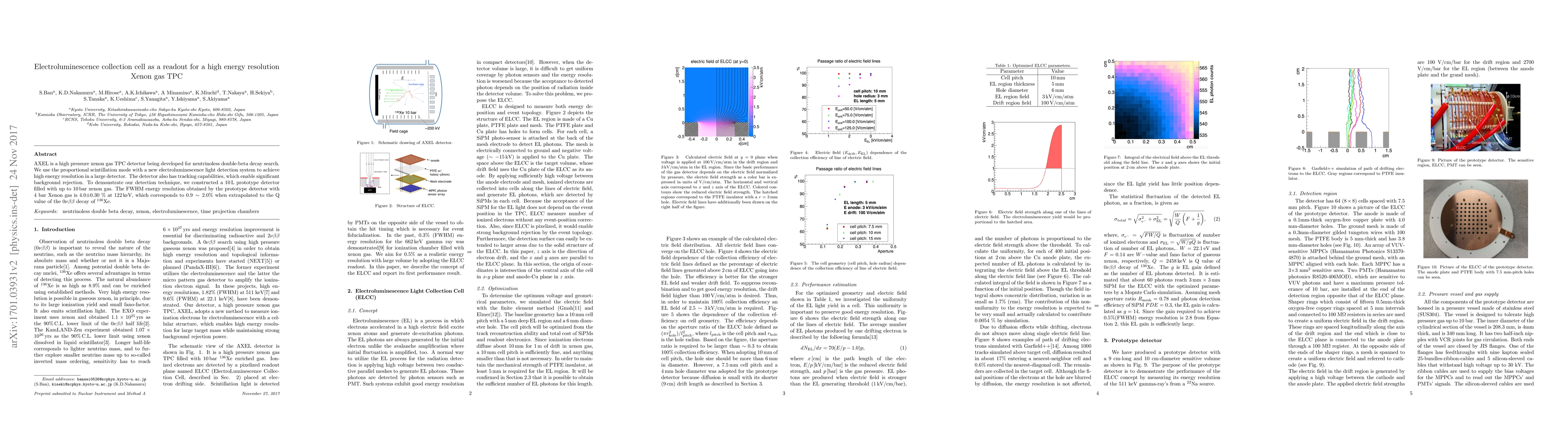 AXEL is a high pressure xenon gas TPC detector being developed for neutrinoless double-beta decay search. We use the proportional scintillation mode with a new electroluminescence light detection system to achieve high energy resolution in a large detector. The detector also has tracking capabilities, which enable significant background rejection. To demonstrate our detection technique, we constructed a 10L prototype detector filled with up to 10bar xenon gas. The FWHM energy resolution obtained by the prototype detector is 4.0 $\pm$ 0.30 $\%$ at 122 keV, which corresponds to 0.9 ~ 2.0 % when extrapolated to the Q value of the $0\nu\beta\beta$ decay of $^{136}$Xe.