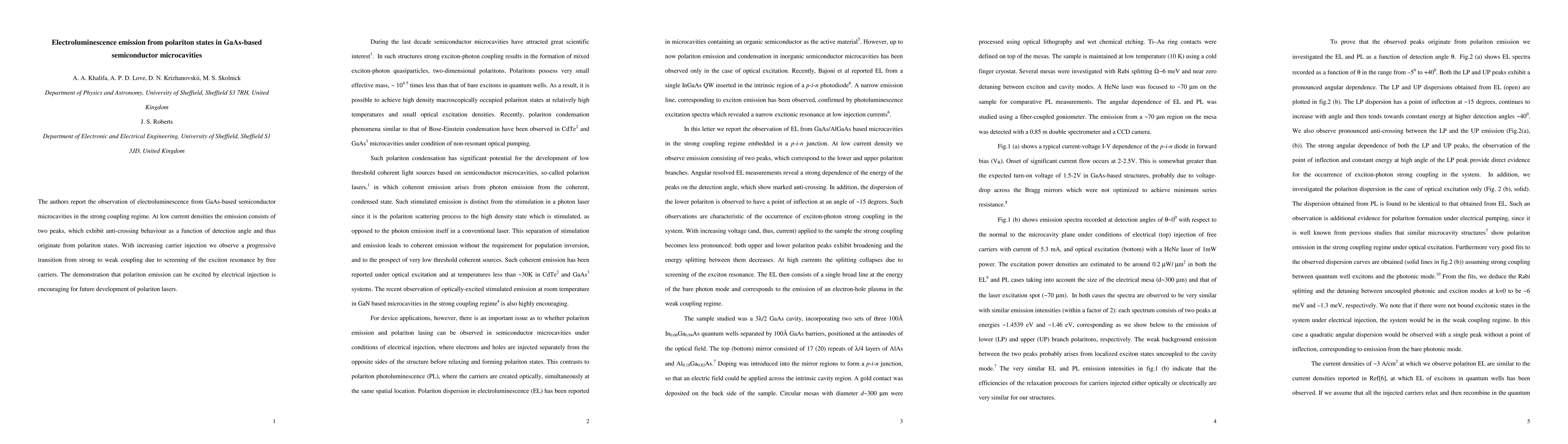 The paper presents a detailed analysis of electroluminescence emission from polariton states in GaAs-based microcavities, demonstrating the transition from strong to weak coupling regimes under varying current densities.