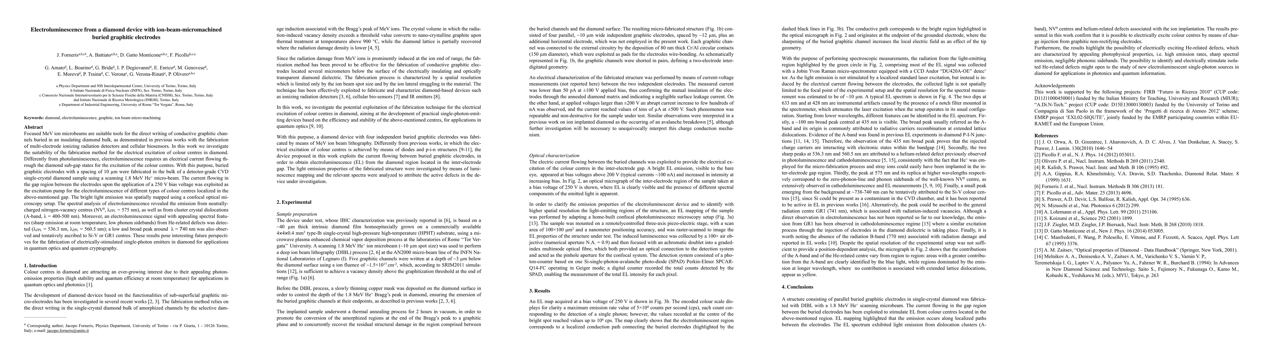 This paper investigates the electroluminescence of diamond using ion-beam-micromachined buried graphitic electrodes, revealing emissions from nitrogen-vacancy centres and other defects, with potential applications in quantum optics and cryptography. The study demonstrates the feasibility of electrically exciting colour centres in diamond through current-induced excitation.